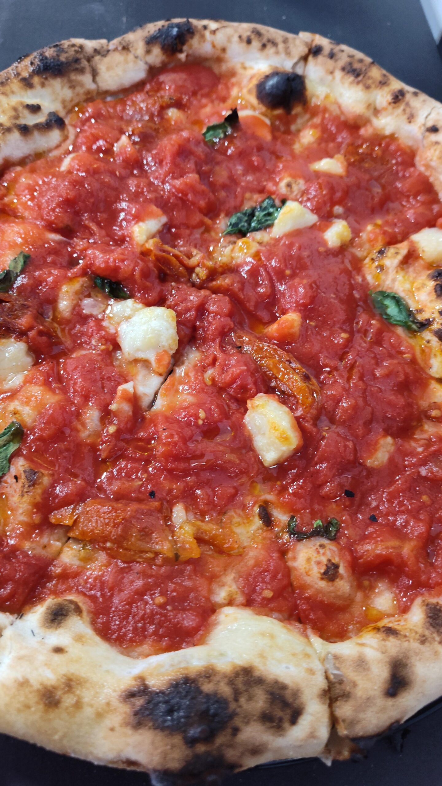 Just a ton of sauce and some basil and parmezan chunks and some really expensive olive oil. 100% Biga 48 hour cold ferment. Oven on 450°C for around 90 seconds. My new favorite.