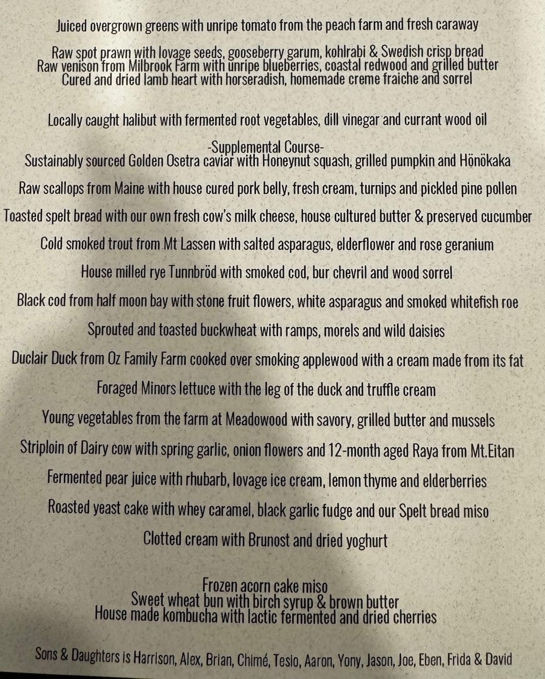 TLDR – nordic inspired, flavorful, California cuisine would return. I went in with slightly low expectations as some nordic-inspired restaurants can be a bit light on flavor, but I was pleasantly surprised. The 2 stars is definitely warranted. I would skip the caviar next time, but was very pleased overall.