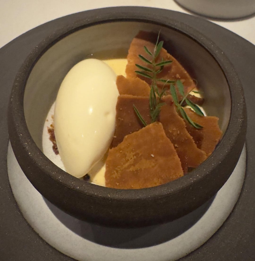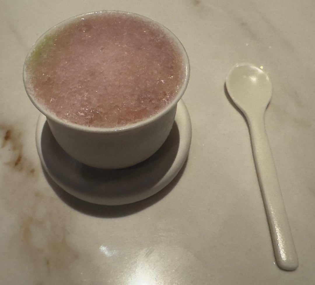 - Fermented pear juice with rhubarb and cream was a perfect palate cleaner. It had acidity, it had multiple temperatures and textures. Perfection.