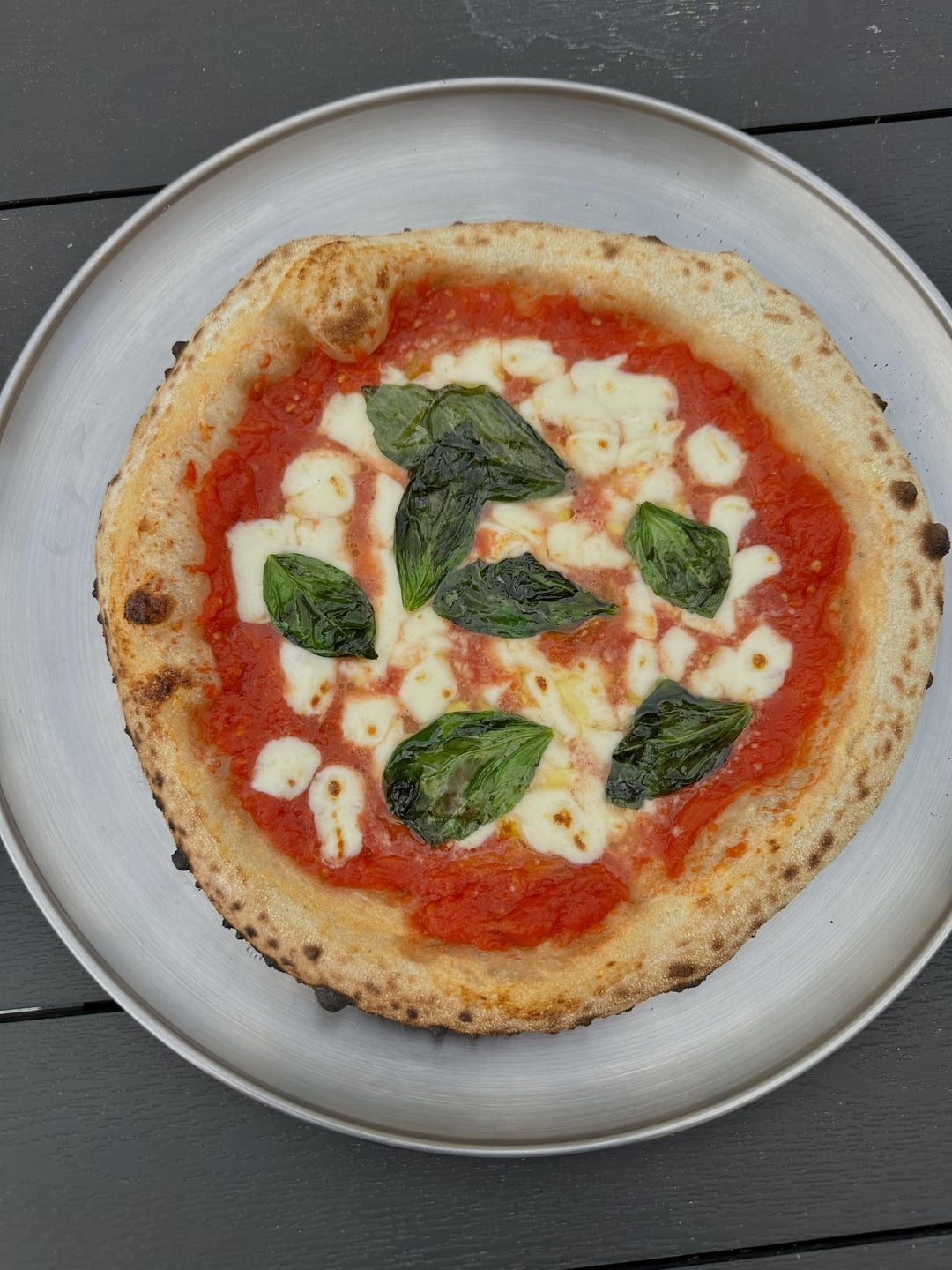 Topped it with hand-crushed San Marzano tomatoes, fresh mozzarella, pecorino romano, and a drizzle of Tuscan EVOO.