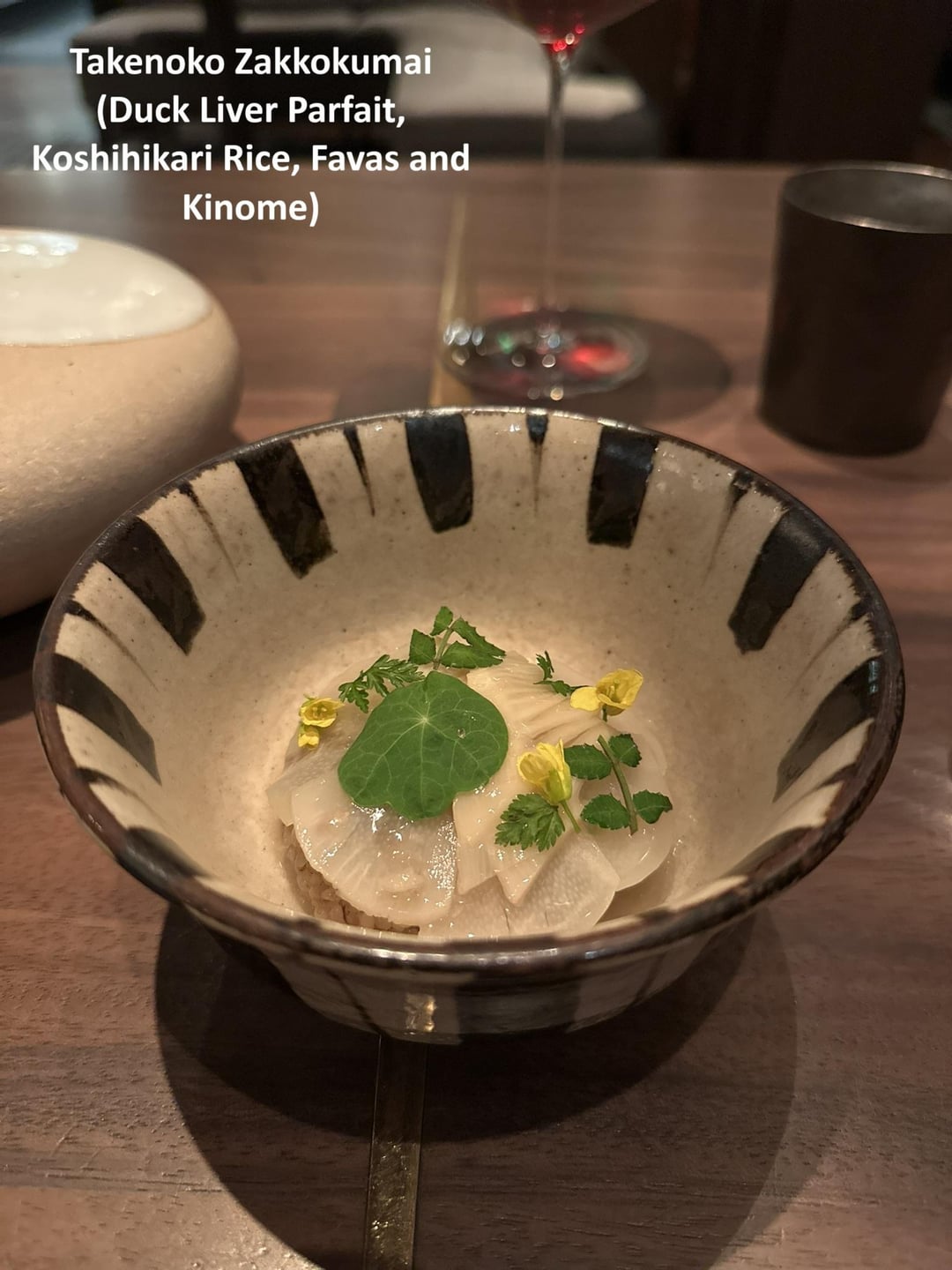 6) Takenoko Zakkokumai – A most satisfying end to the savory courses, a dish that highlights young bamboo shoots. Sliced bamboo that I believe was braised, sitting atop Koshihikari rice all swimming in a sauce/broth made from duck. This dish brought the meal full circle for me. The first few courses focused on fresh while the cod and the duck showcased some richness. This, however, was comfort food. One that made me close my eyes and smile. Coming from a culture where rice is a mainstay of almost every meal, seeing a rice dish as a showstopper was immensely gratifying. I later learned from the somm that a Kaiseki typically concludes with endless servings of rice and broth. I would happily take another bowl of this. The dish was also accompanied by a tempura made with a herb and filled with duck liver parfait, a nice crispy sweet break in between bites of the hearty rice.