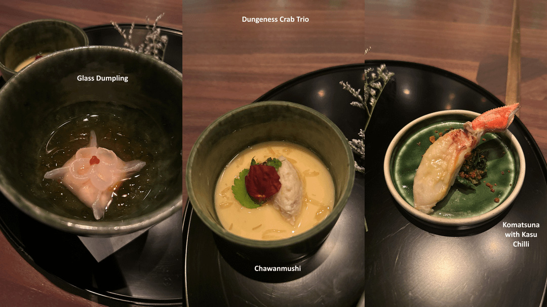 2) Dungeness Crab Trio – Crab, for me, is the tastiest meat so a trio of dishes focused on crab was a treat. They were executed well too. Starting off with a satisfying dumpling swimming in an intense broth. The second, a flavorful chawanmushi with a dollop of crab meat and lastly, a piece of the claw served with perfectly spiced greens. No waste of crab here.