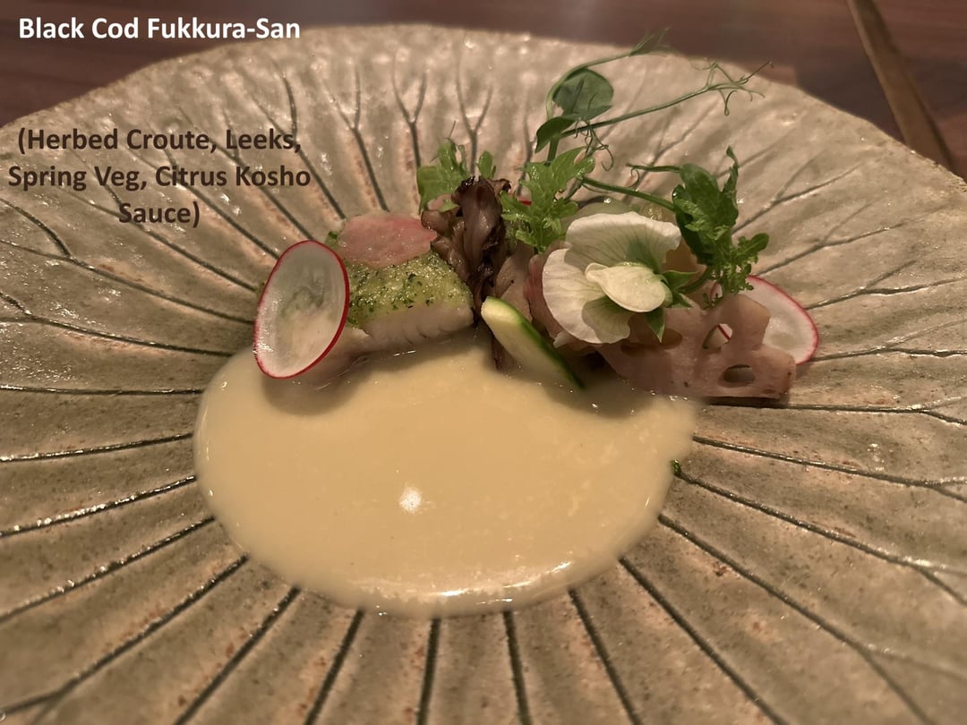 3) Black Cod Fukkura-San – Beautifully cooked fish accompanied by a brilliantly executed citrus sauce. Typical dish expected in a Michelin starred setting. But this plate is a good example of the vegetables elevating the dish to a new height. Leeks that have been cooked down to almost a soft jam accompanied by other spring vegetables that have retained their crunch. This was also an example of the beverage team nailing a pairing with a beautiful sake.