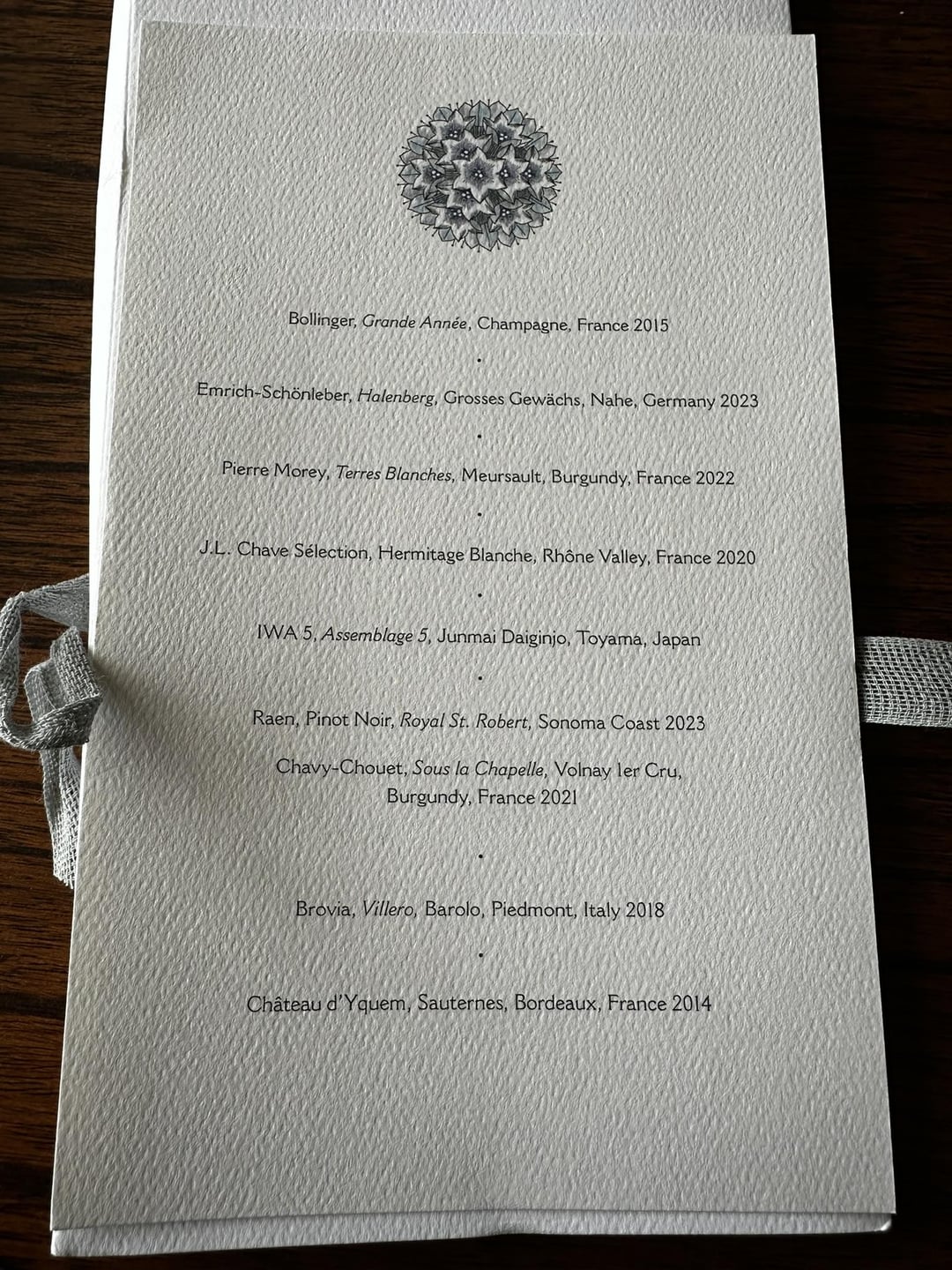 I find it difficult to gauge absolute value for wine pairings. What I will say is that having done similarly priced pairings in Copenhagen and after the gasp-inducing pricing of Addison from a few days prior, SingleThread’s “luxury” option left me the most satisfied at this price point. It featured some great producers that I probably won’t have the option of tasting by the glass anytime soon, and very generous pours relative to other restaurants of this caliber.