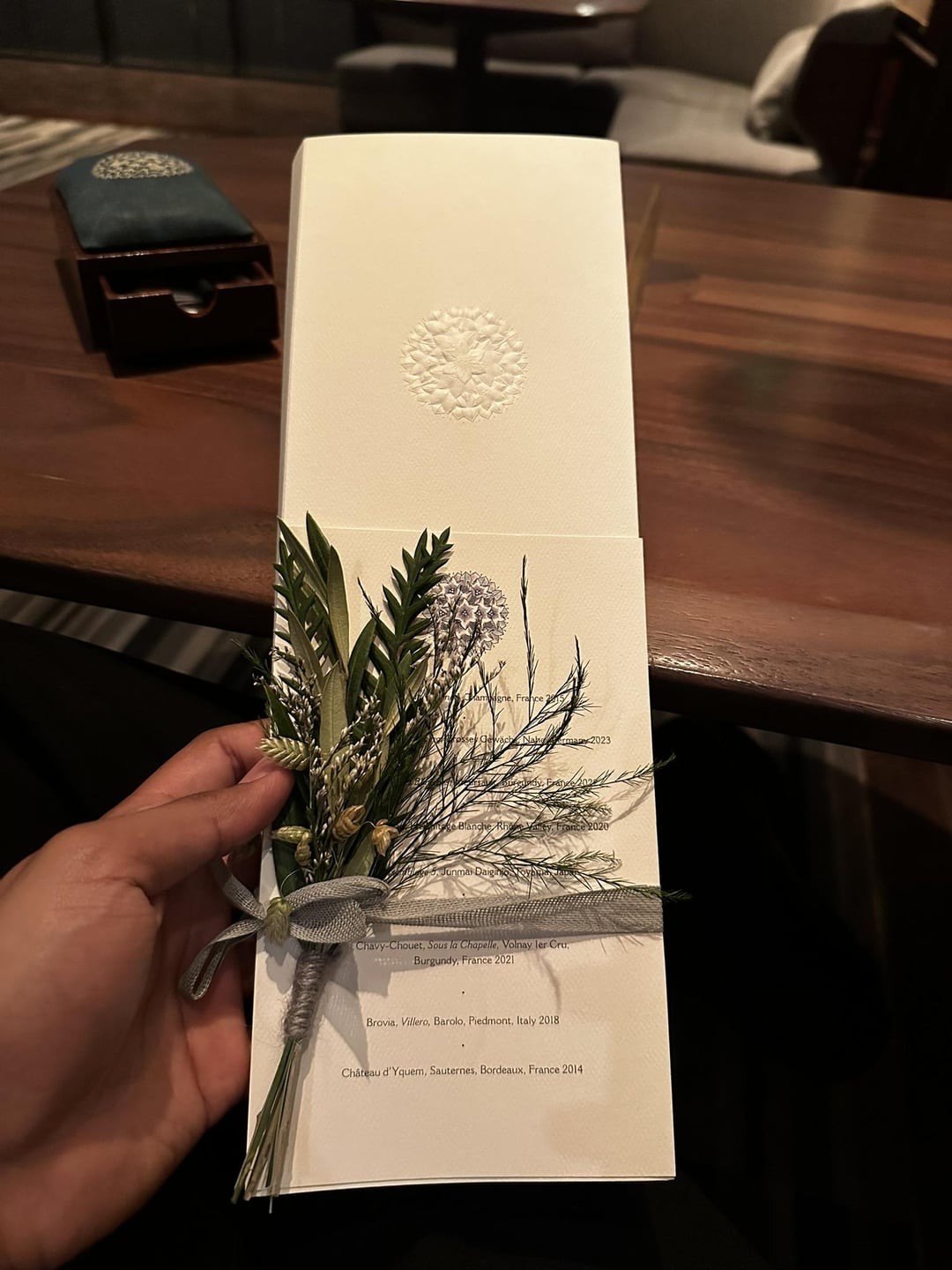 The pairing largely consisted of wines from the Old World. Every single pour was beautiful. Every single pour was better than the last. What was slightly weird about SingleThread’s luxury pairing was that on a couple of courses, for my palate, the wine did not pair particularly well with the food. The pairings for the crab course (with a Meursault) and the rhubarb “salad” course, (which I don’t have a picture for – paired with an Hermitage Blanche) felt like flavors competing for attention on my palate that took away from the food and wine individually. I was surprised by this finding in the moment. Although, I must say both pours were wonderful and enjoyable on their own. This pairing also allowed me to sample a glass of Chateau d’Yquem, which was a surreal moment. It was divine nectar that paired impeccably with the desserts. It’s the slowest I have ever drunk a glass of wine, trying to extract the joy for as long as I could. Later at the end of the meal, when the host asked me what my favorite course was, I jokingly said it was the d’Yquem.