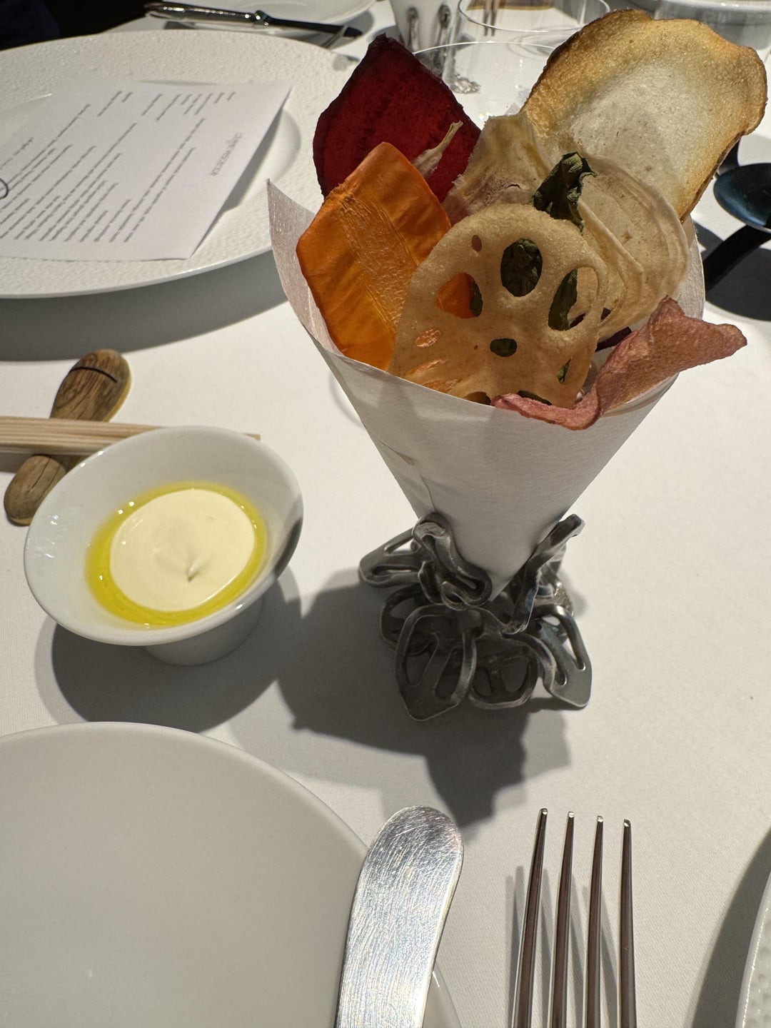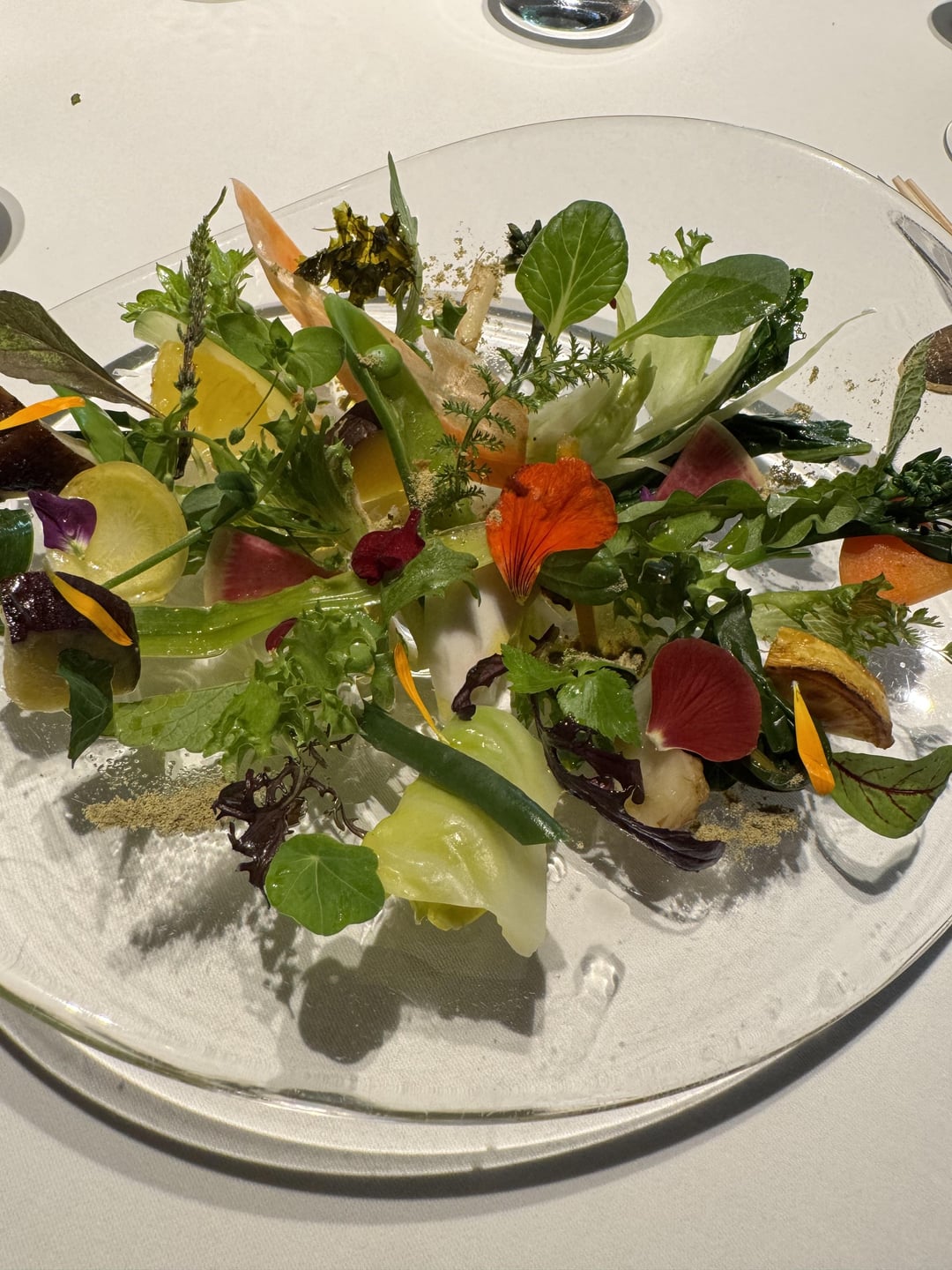 Lunch consisted of about 8 courses, and a full menu is pictured. There were a mix of very good dishes but a few lackluster ones. The vegetable crisp was a good start and the tofu sour cream dip that was provided was extremely addictive. I also really liked the salad, which is made with 50+ seasonal veggies. It was really refreshing and provided a taste of spring. The signature turnip dish was also a stunner. Strikingly plated, it looks bland but was surprisingly flavorful and juicy. The duck dish also blew me away. The duck breast was tender with just a right amount of skin and fat without any gaminess. The smoky infused protein paired perfectly with the red wine sauce. The companion raviolis were umami-laden bombs which were quickly devoured. The main dessert dish, a hazelnut crème brûlée paired with hassaku orange was a delight as well.
