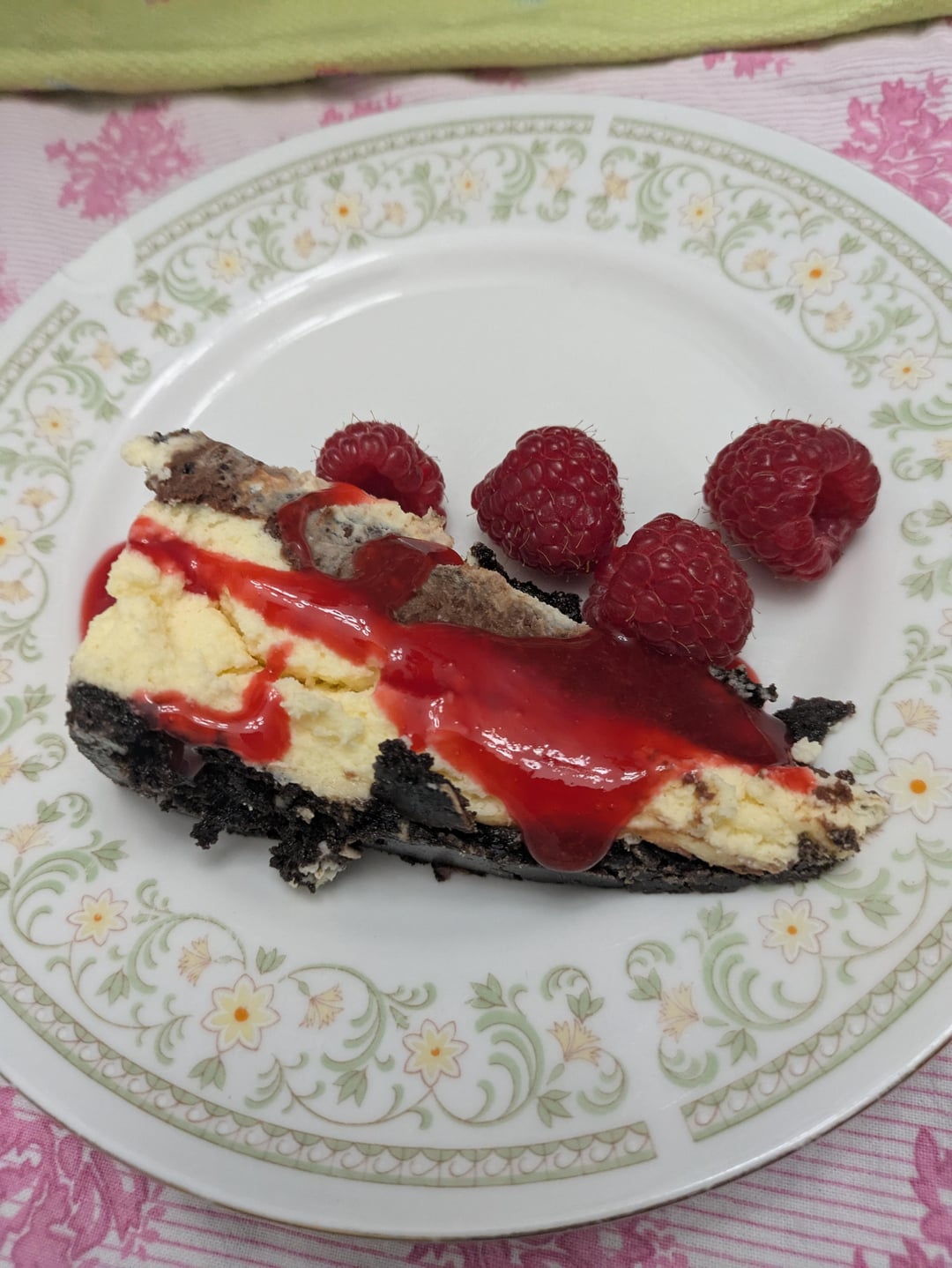 The top was a bit of a mess. It gathered up onto the sides, so I cut some off before pouring on a ganache to cover any roughness. Served with fresh raspberries and raspberry sauce.