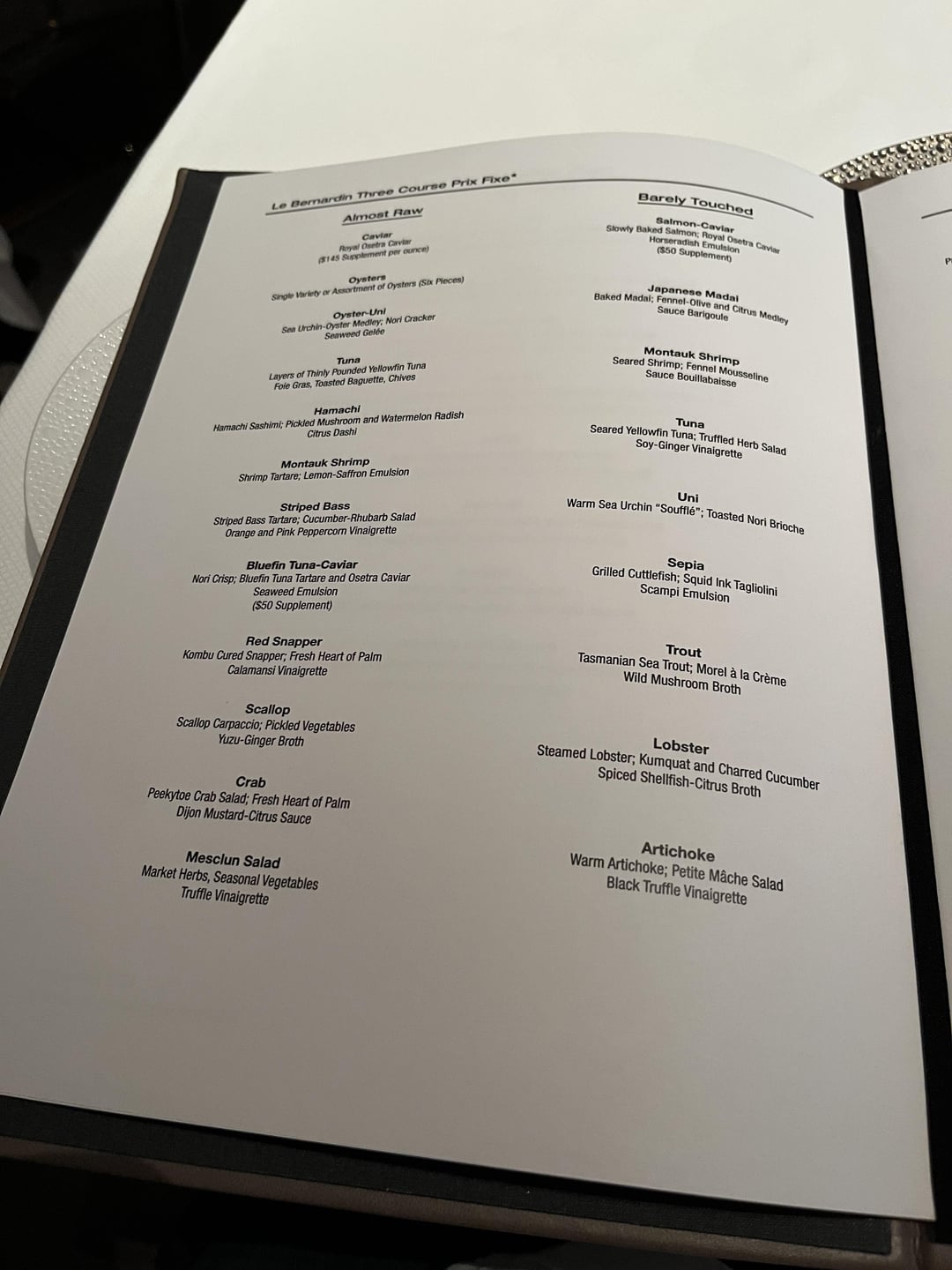 Having done the tasting menu and lunch at Le Bernardin multiple times, I’ll always recommend the lunch prix fixe.