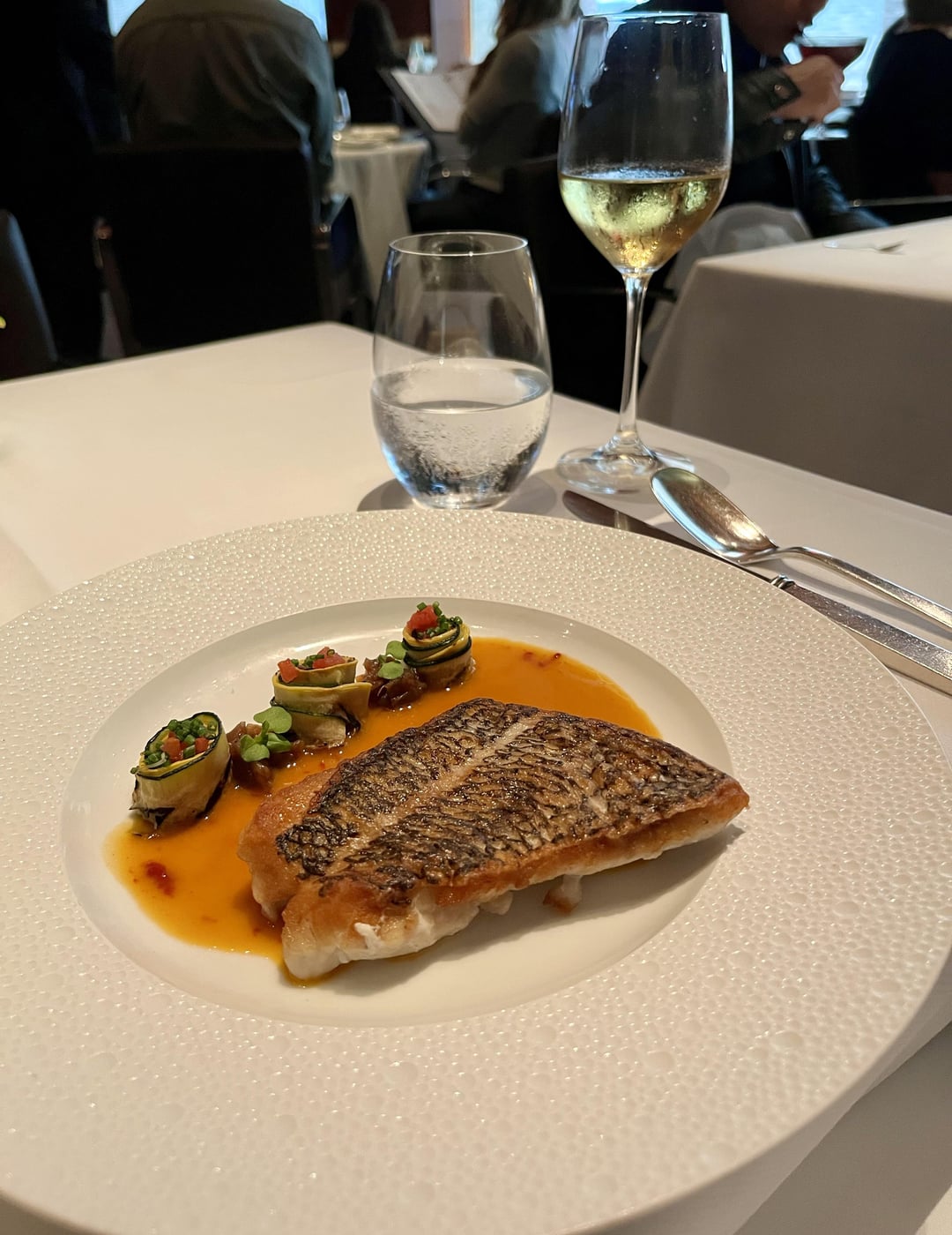• Main course selection (crispy black bass, roulade of Provençal vegetables, preserved lemon-smoked pimentón sauce. Not my favorite main I’ve had from them, but still delicious)