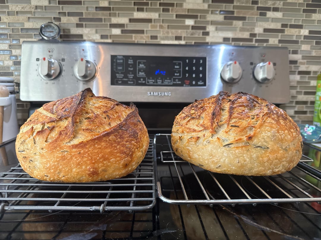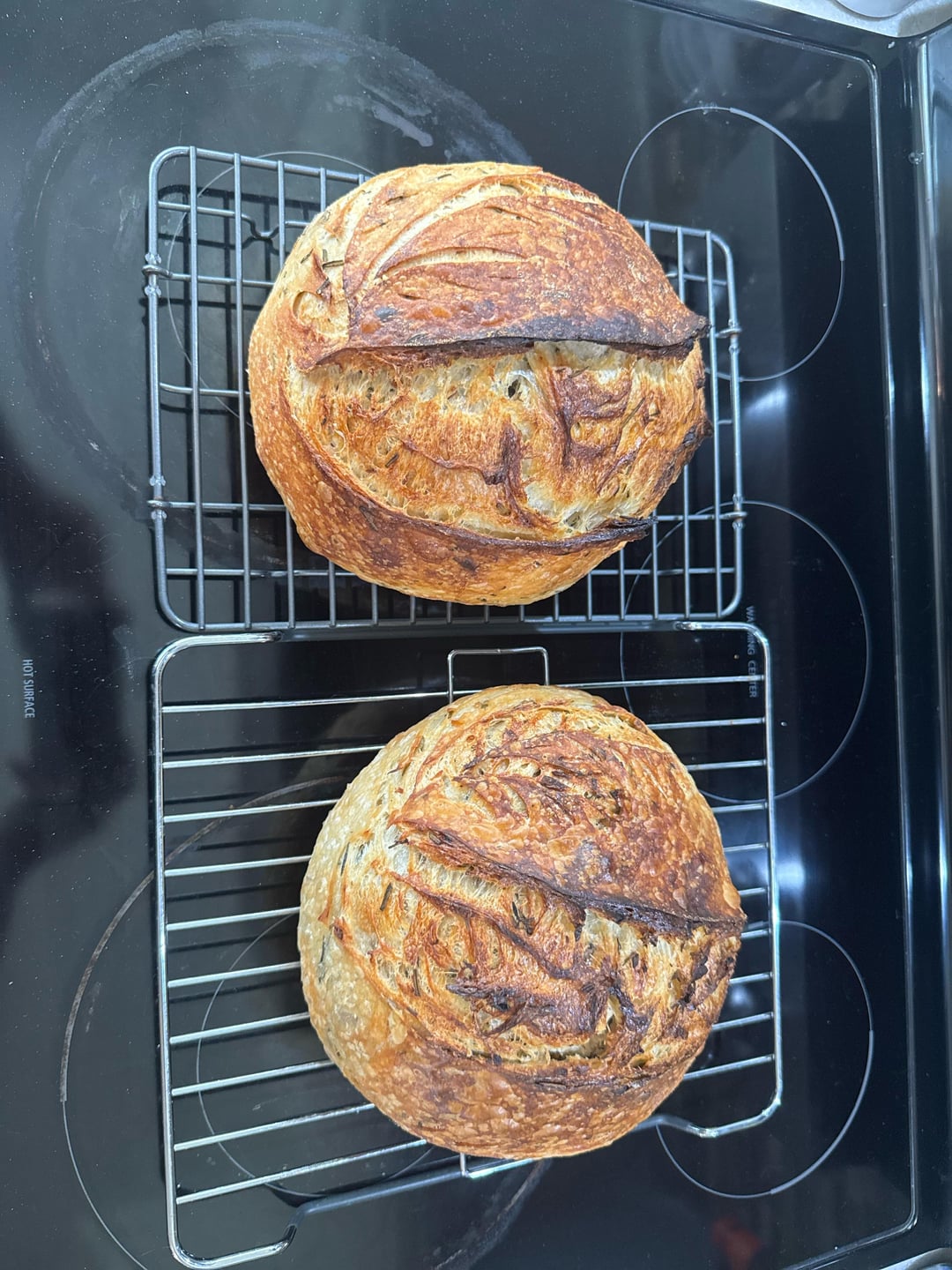 Step L: check that internal temp has reached 206F. Coo at bread bc it’s so pretty. Sit on your hands for two hours before cutting.