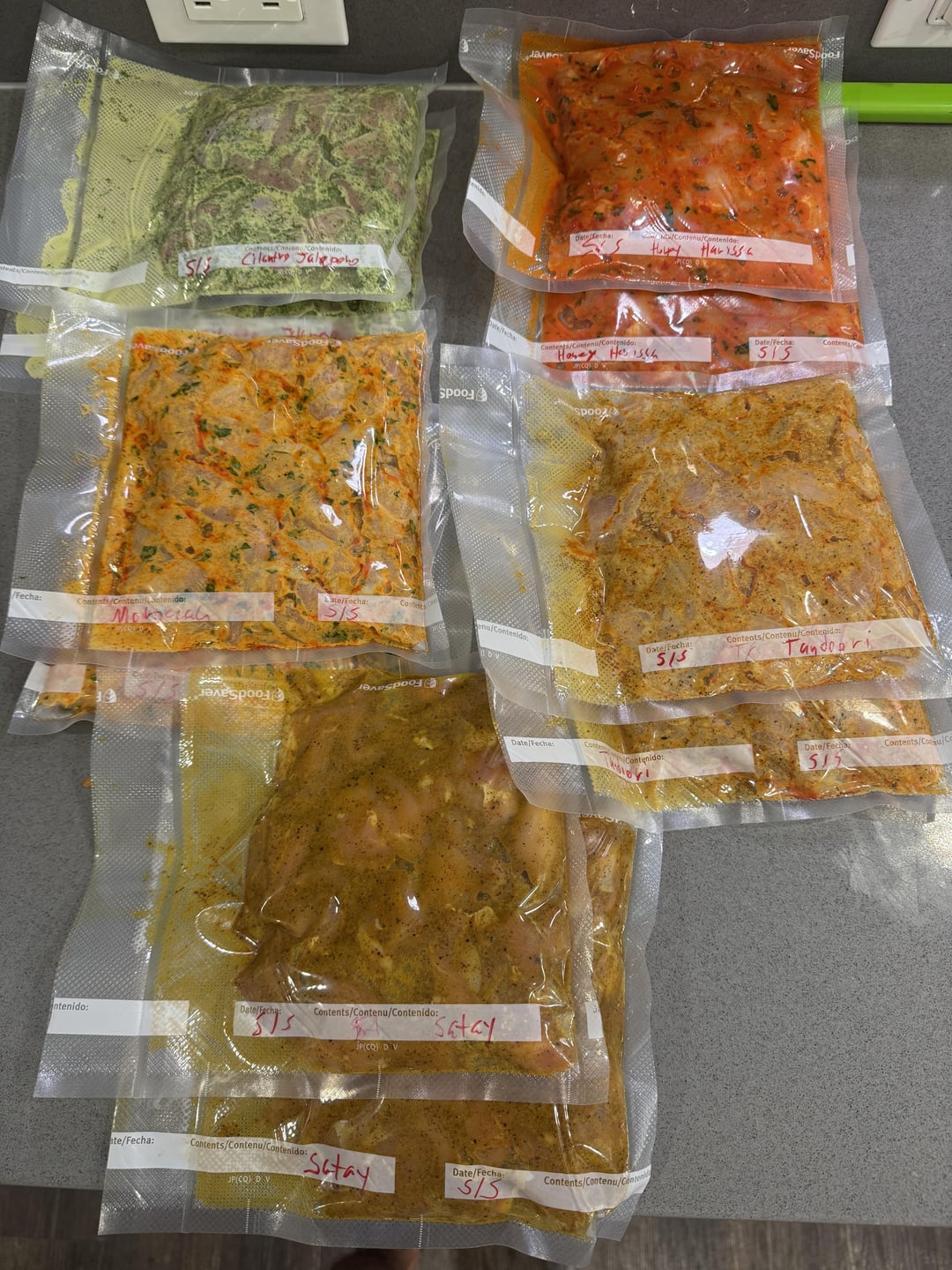 Each pack has half the marinade for a given recipe and roughly 3/4lbs of thighs.