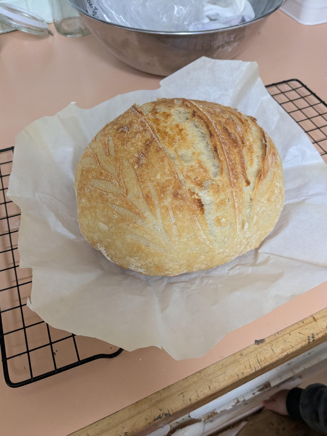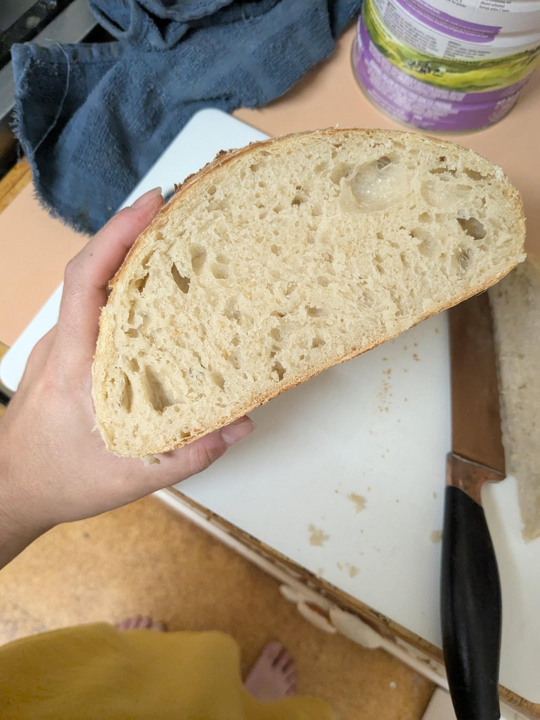 It's maybe a little gummy/chewy. Cut it a bit over an hour after it came out of the over because my 2 year old demanded it. Feel like it might be under proofed but I have no idea what I'm doing 🤣 all in all I'm pretty happy even if it's not perfect!