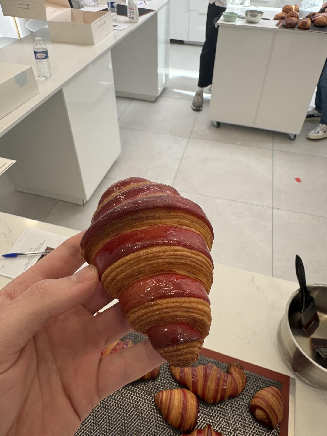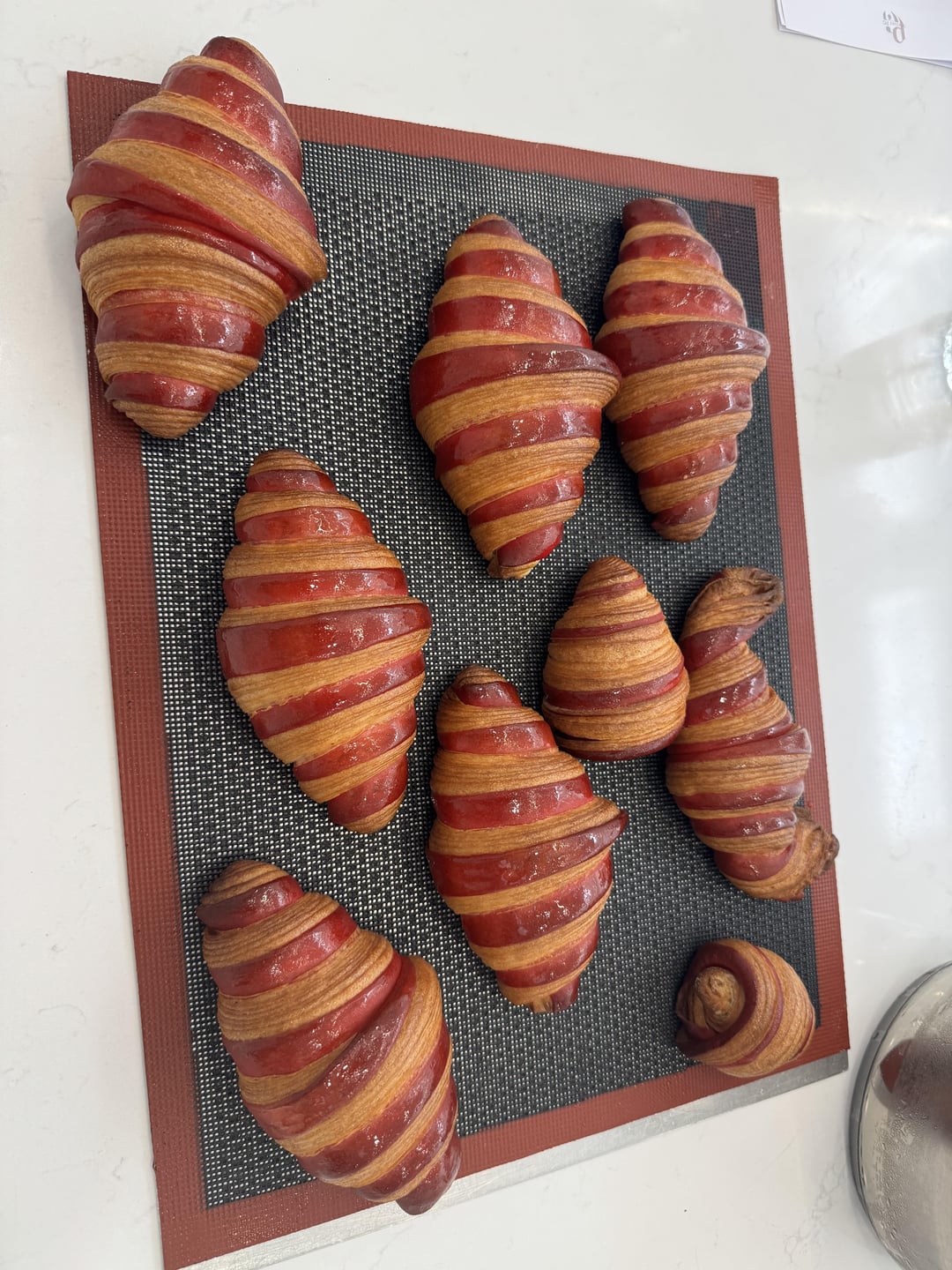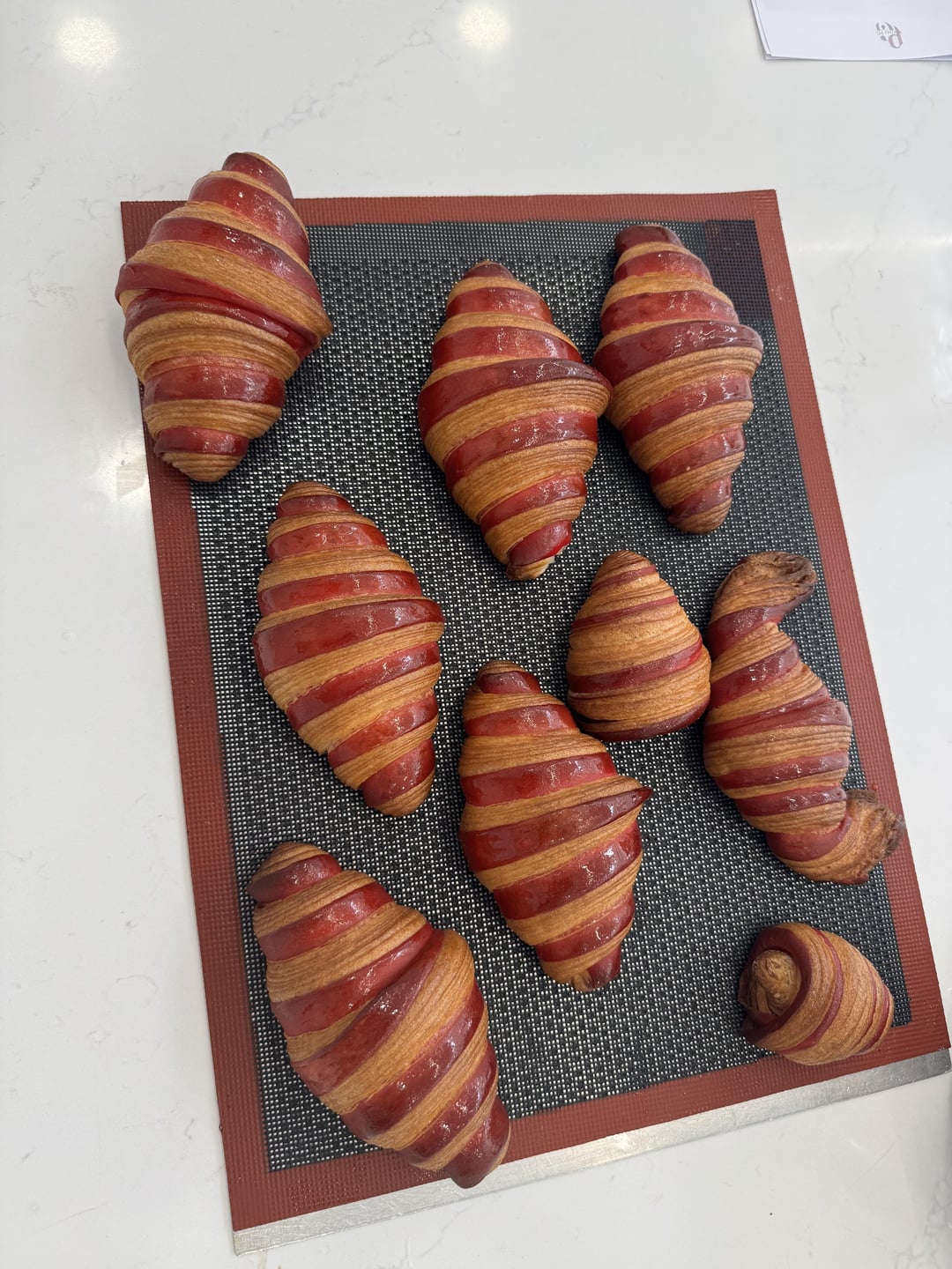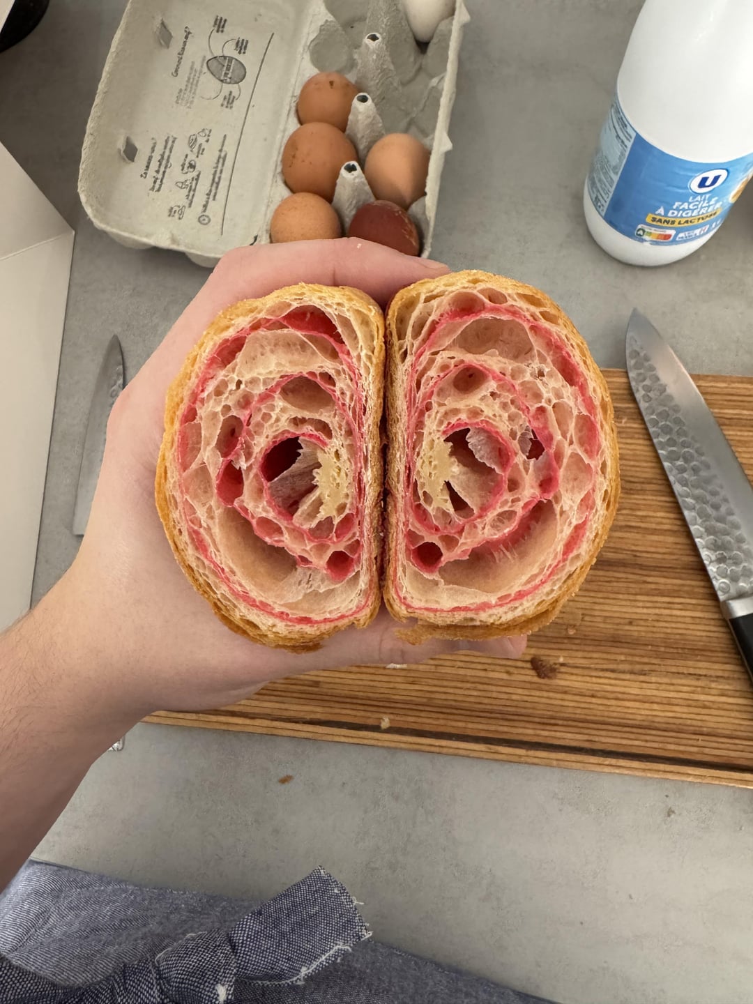 Some of you may have seen all my previous posts on croissants. And I think I’m finally getting a good and consistent result on them. Here’s a picture of bicolor croissants, not they’re not stuff with raspberry or anything but they could be. And yes there’s a cross section waiting for you on the lasts pics 🙂