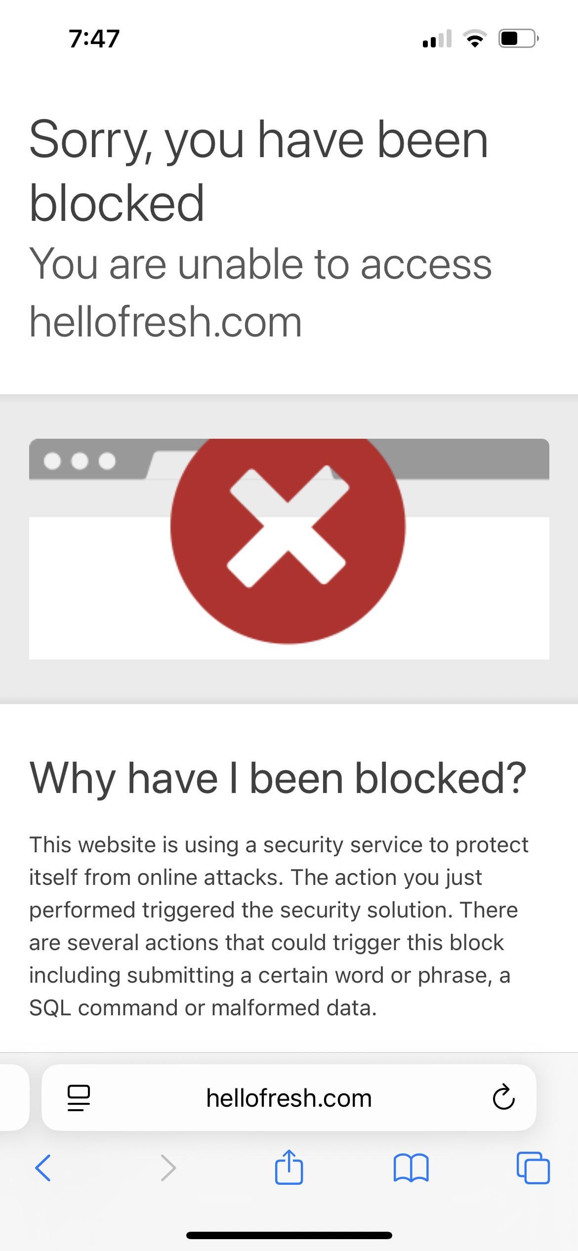 Anyone else randomly get blocked from Hello Fresh’s website?! We’ve been using HomeChef for over a year now and was thinking about switching, but now I can’t even get on the site lol guess not