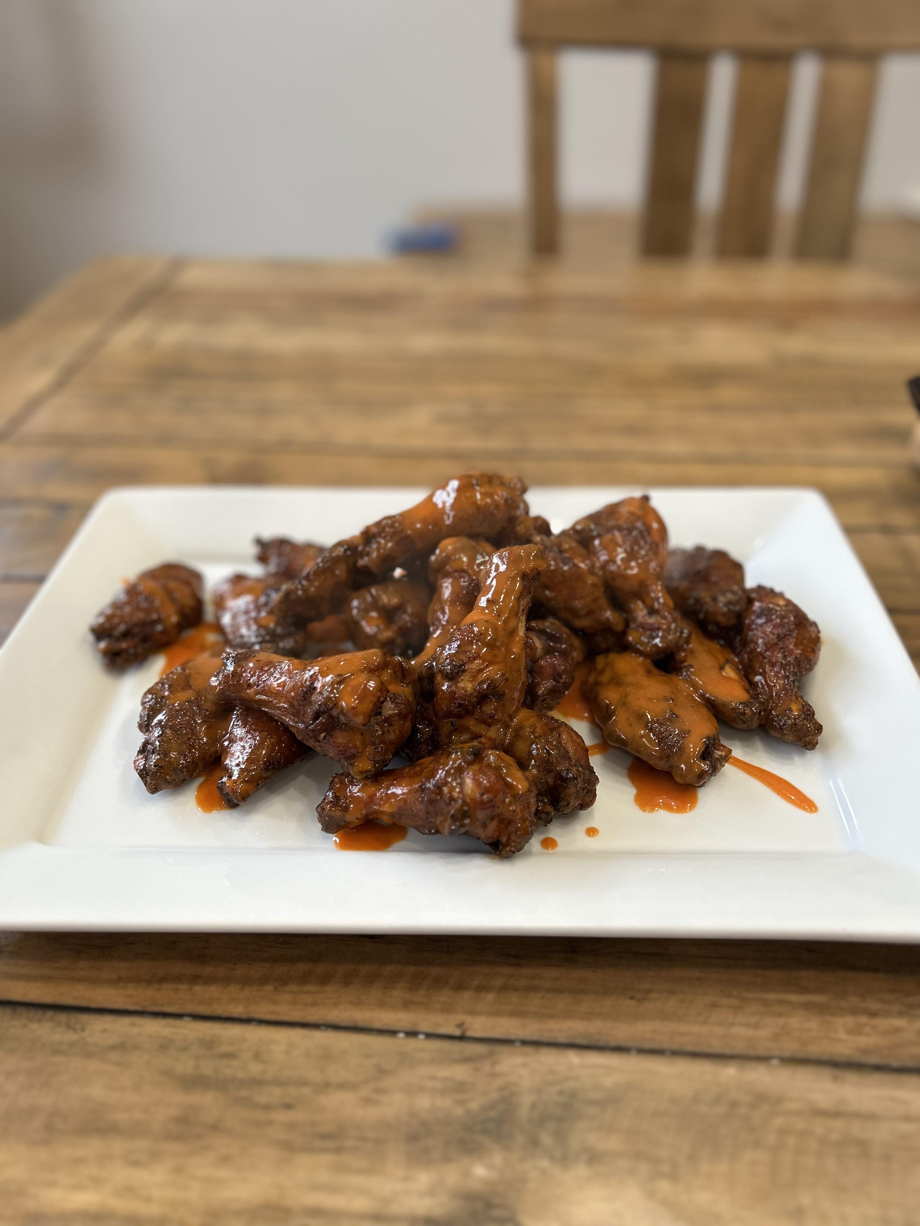 Nailed the wings tonight on the Joetisserie. 400F for 30 minutes covered then 10 minutes uncovered for crispiness. Tossed in a chunk of applewood for some smokiness.