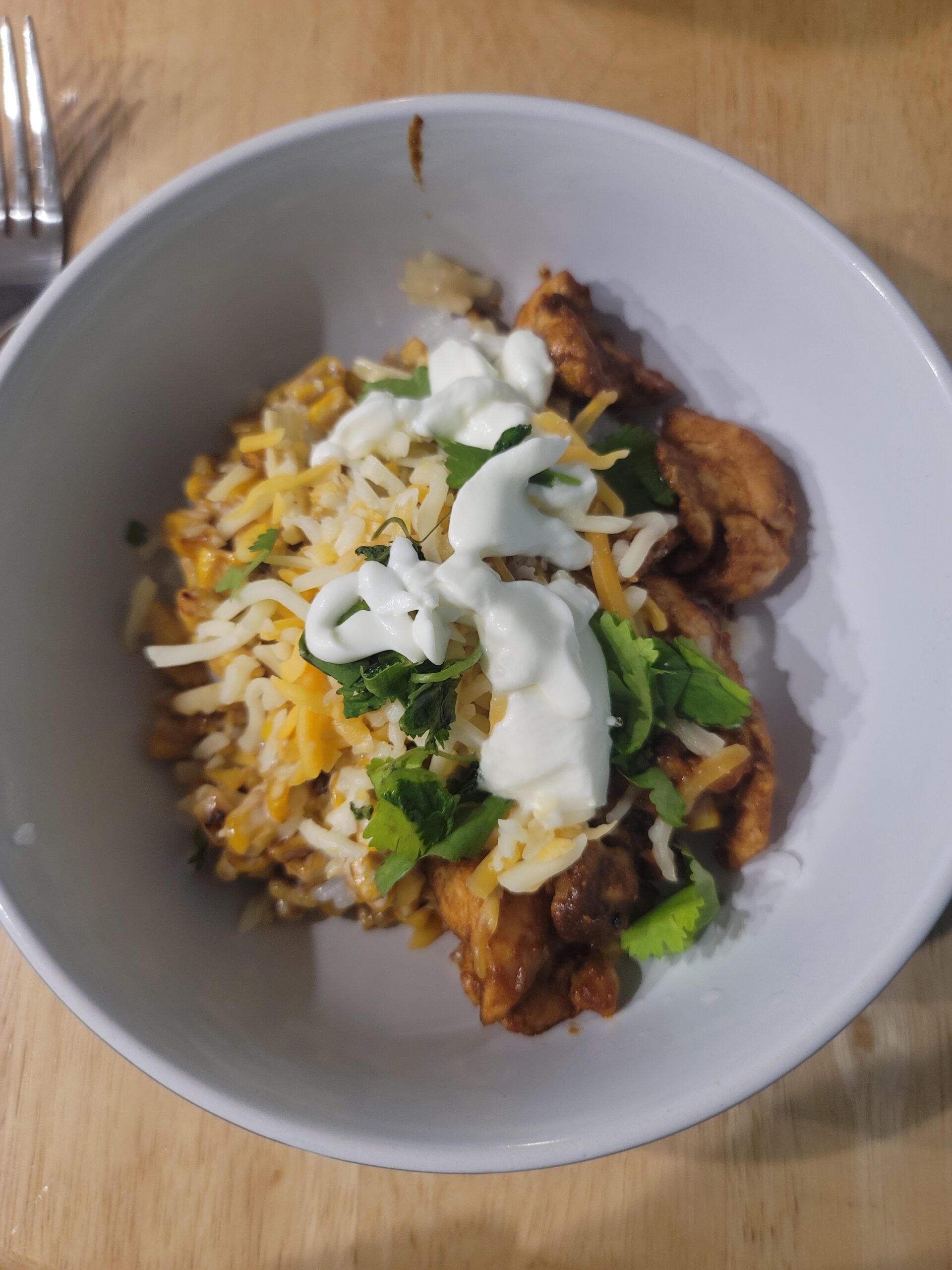 Taqueria Chicken bowl with rice and corn Esquites – honestly really good and I would order again! I overcooked the rice because I got distracted 😂 Relatively easy to make