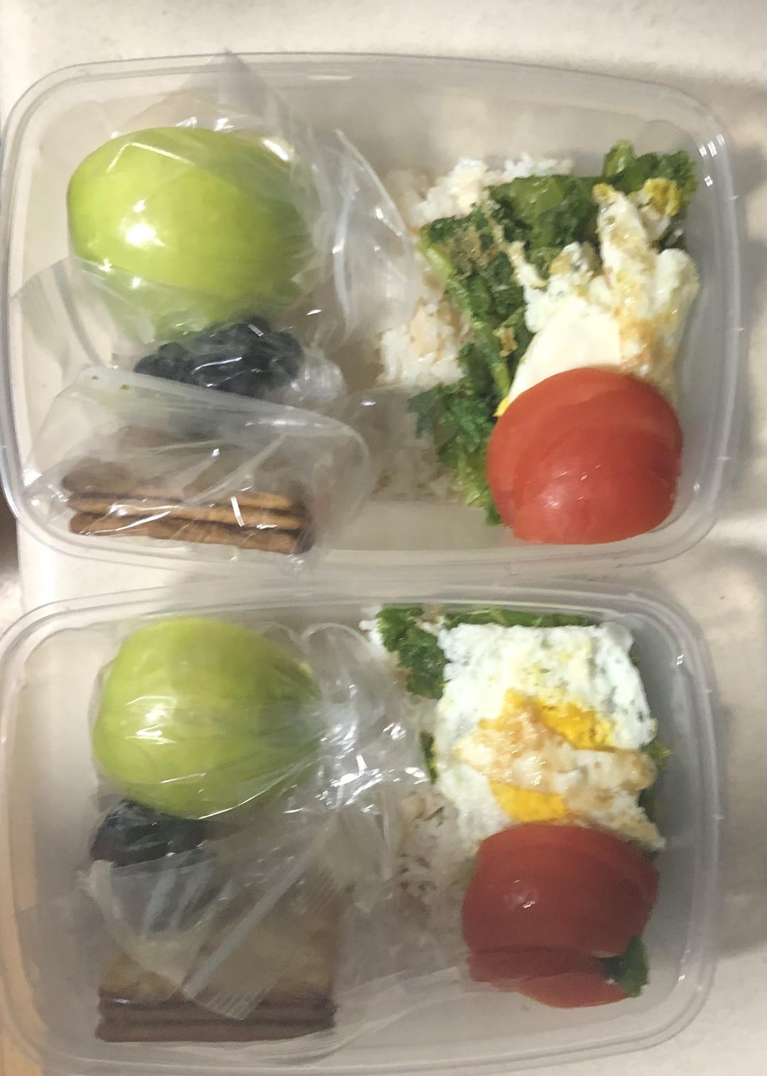 Left (lunch): Apple slices, blueberries, whole wheat crackers, Fried jasmine rice with cut up chicken slices mixed in, boiled kale, fried egg, tomato slices