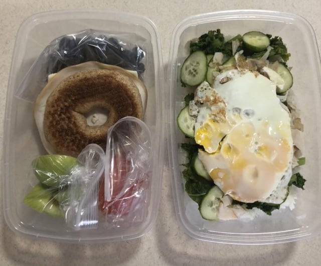 Right (dinner): Jasmine rice, chopped up boiled kale, cucumber slices, cut up and fried chicken slices, fried egg