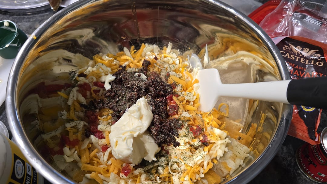 I love the sundried tomato post oak pimento cheese from heb! It's so damn expensive for what you get so I made some myself for about 1/3rd of the cost. Idk why the tomatoes look black in the second picture but they were new