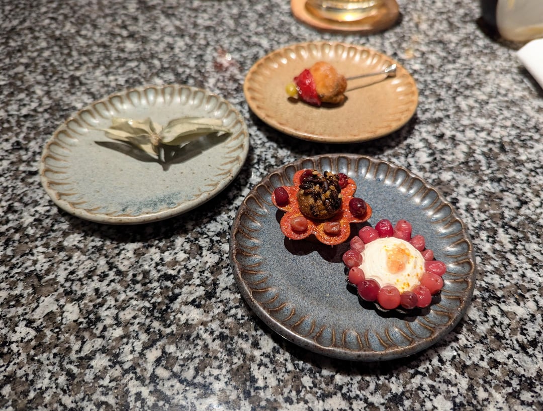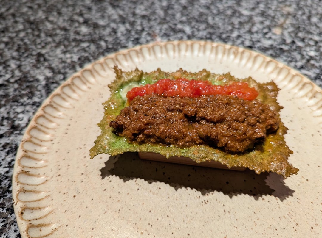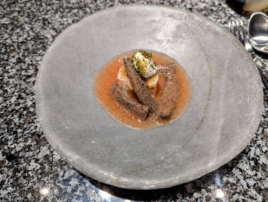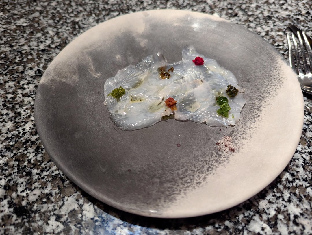 Snapper crudo in the shape of Australia with native ingredients from each state dotted on. Tasmania was salt & pepper. Very strong & bordering on too fishy, perhaps it was aged? And that's coming from someone who loves seafood.