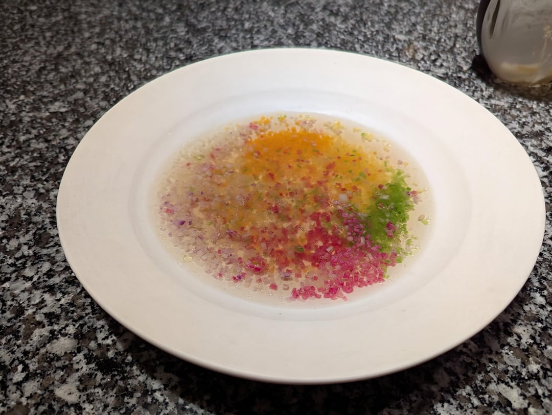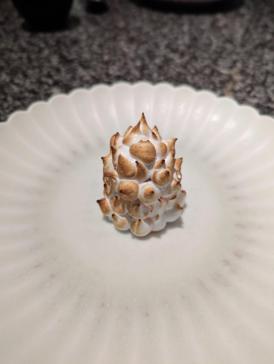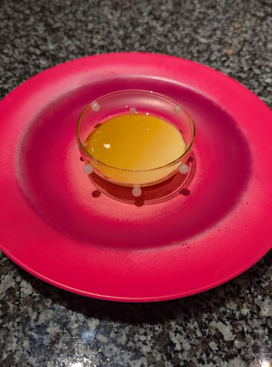 Not pictured. We got brought out to the pastry kitchen and served 'jube', tiny pieces of citrusy jelly. Then we went through an art installation in the garden that was like an overgrown disney forest. The magic mushroom was choux pastry filled with mushroom creme. There was also a fizzy pineapple drink. Both were good.