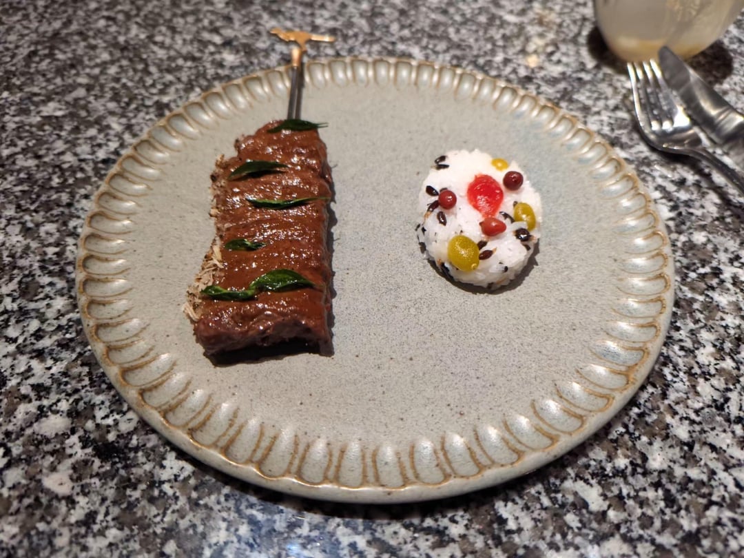 Kangaroo satay with saltbush. Sticky-ish rice with quandong fruit. The taste was nice but I found the satay sauce too overwhelming