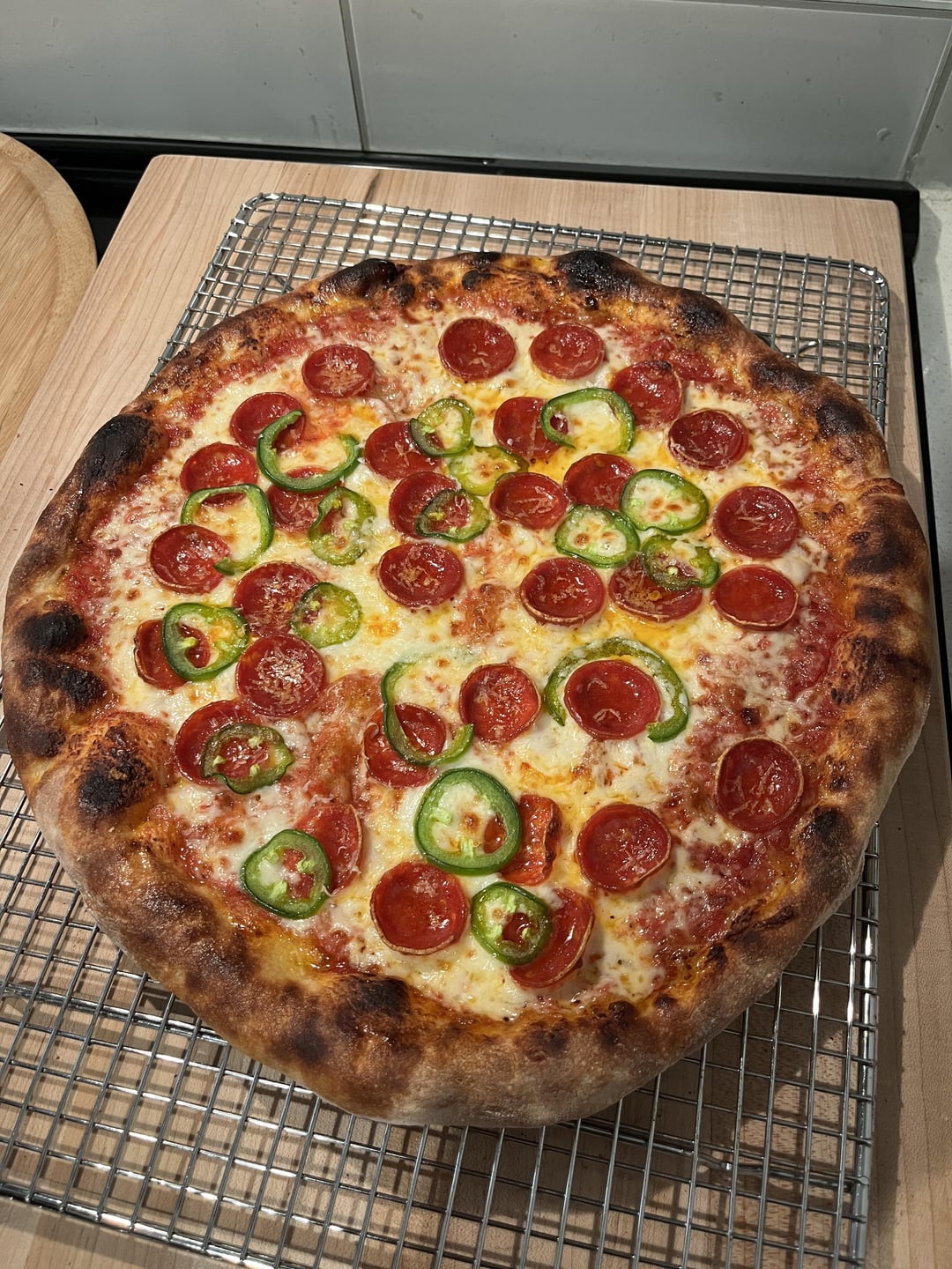 Preheated oven to 550 for at least an hour with pizza steel on the lowest rack right about the lower heating element in the oven. Stretch the dough, add sauce and a healthy sprinkle of Locatelli cheese and par bake for about 2 and a half minutes on the steel. Took the pizza out and topped with the 50/50 mozz mixture, pepperoni and sliced jalepeno, cooked for another minute on the steel then moved to the top rack with broiler on high for 30 second increments until nicely browned. Finished with freshly grated parm and a little EVOO on the crust with Mikes hot honey drizzled on individual slices.