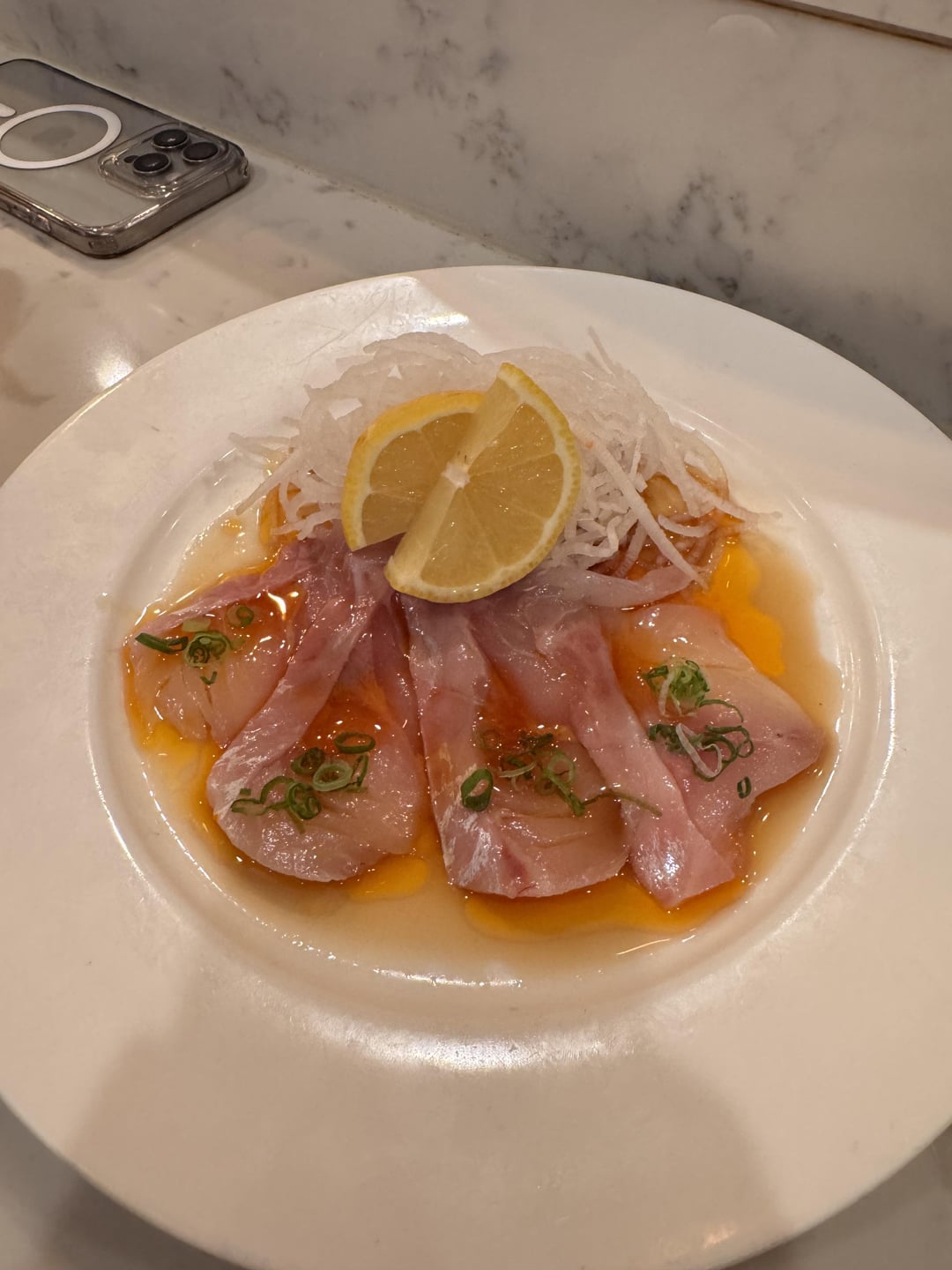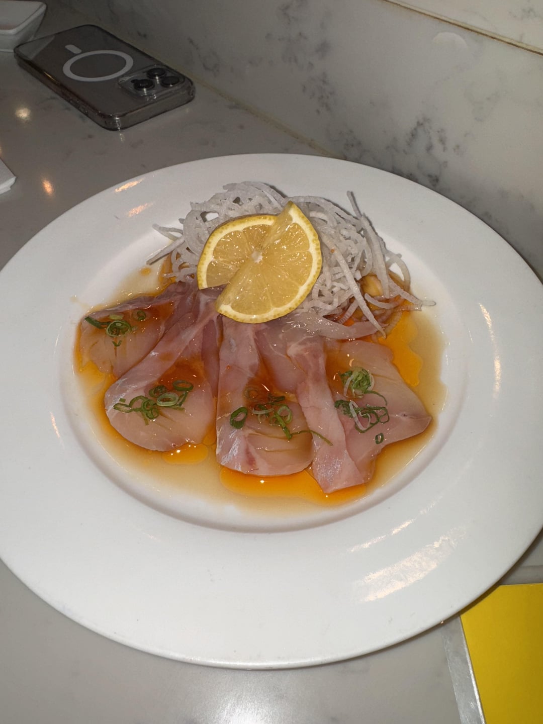 alvarisle 9 months ago It doesn’t look like yellowtail to me, it’s giving seabream.Maybe kurodai with a spicy radish and green onion garnish. Some ponzu sauce? Maybe some sort of oil in the mix, yuzu?