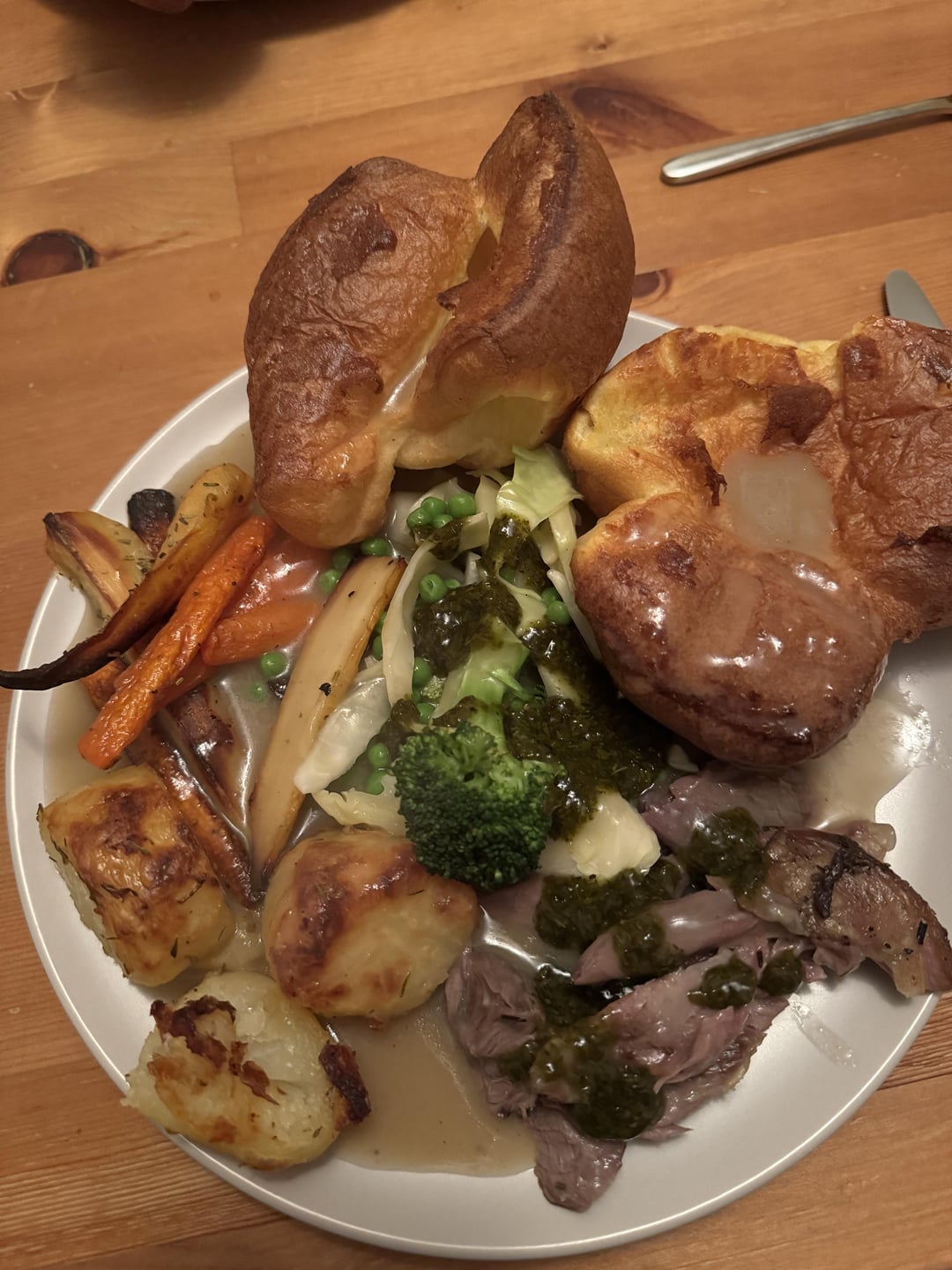 Slow cooked lamb shank, homemade roast potatoes, honey and rosemary carrots + parsnips, homemade yorkshires, then some cabbage, broccoli and peas for health. all covered in homemade gravy and mint sauce😋 by daddyysgirl21 Write A CommentYou must be logged in to post a comment.