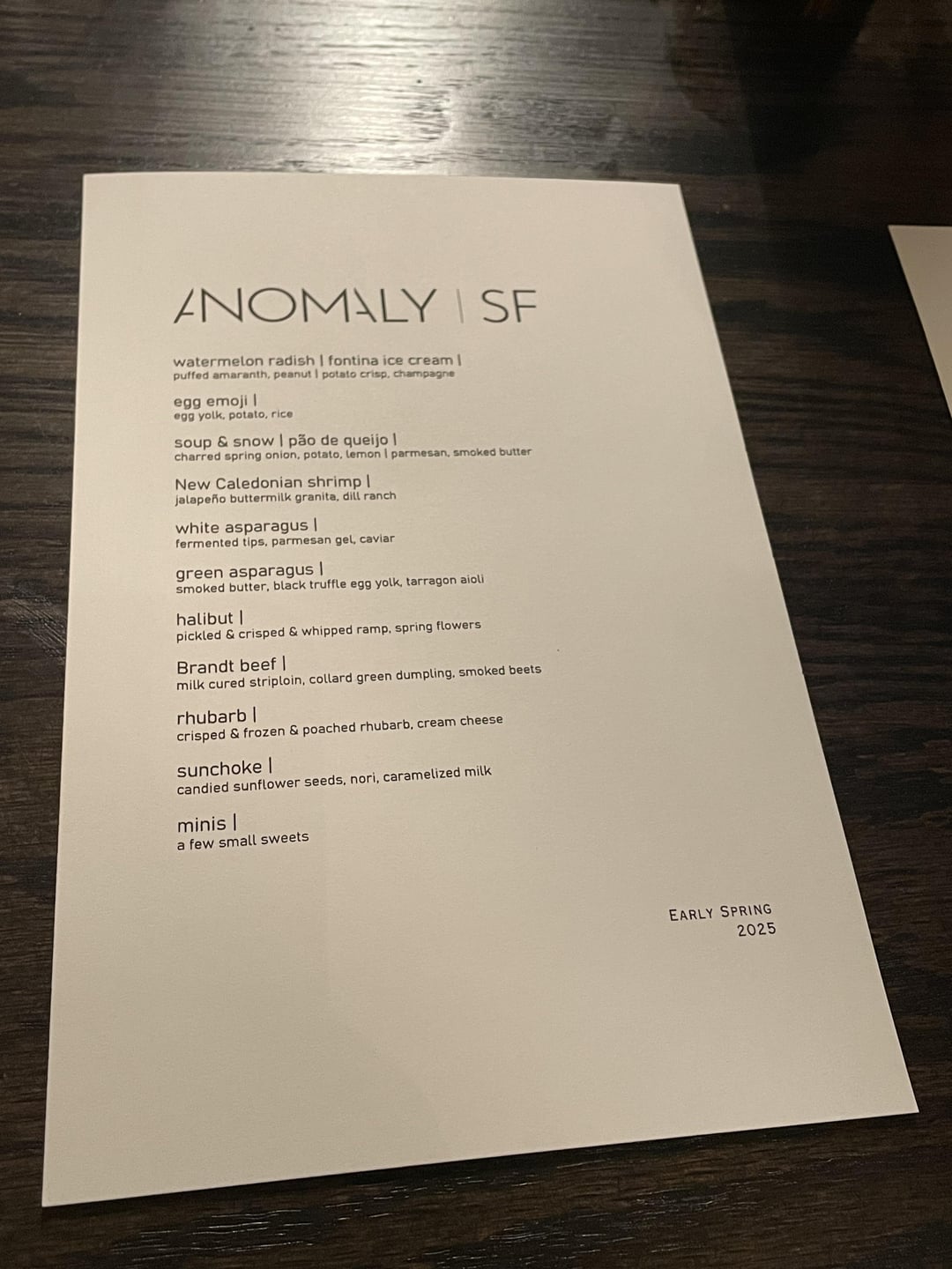 Long time lurker, first time actually posting because we had an amazing experience at Anomaly the other day and wanted to give it some love. The spring menu was great and the asparagus and halibut courses really stood out. The serving team was awesome as well, and helped us craft a mini dessert wine tasting flight, as none of us have really tried those types of wines before!