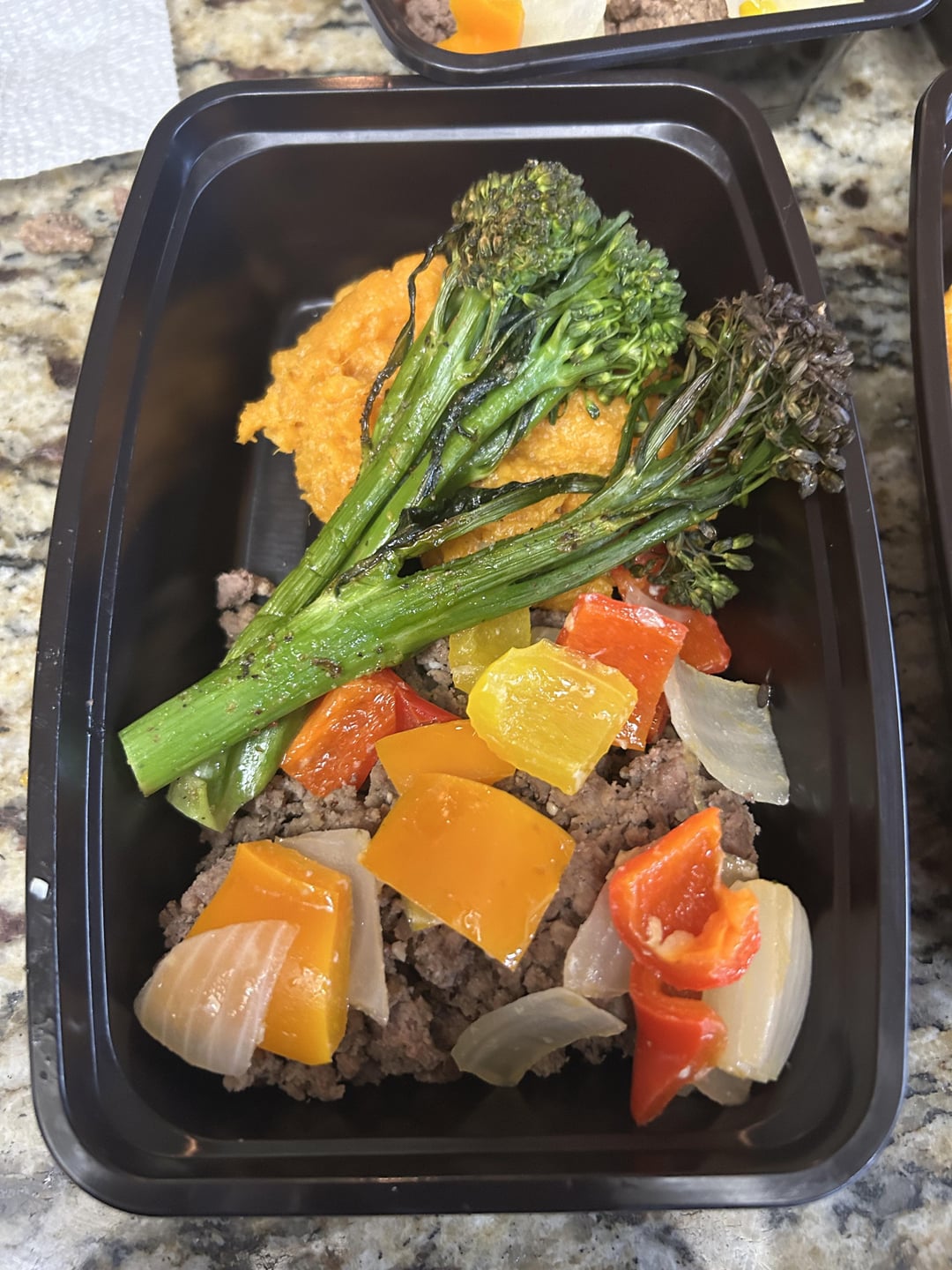 Ground beef with roasted broccolini, bell peppers, onions, and savory sweet mash.