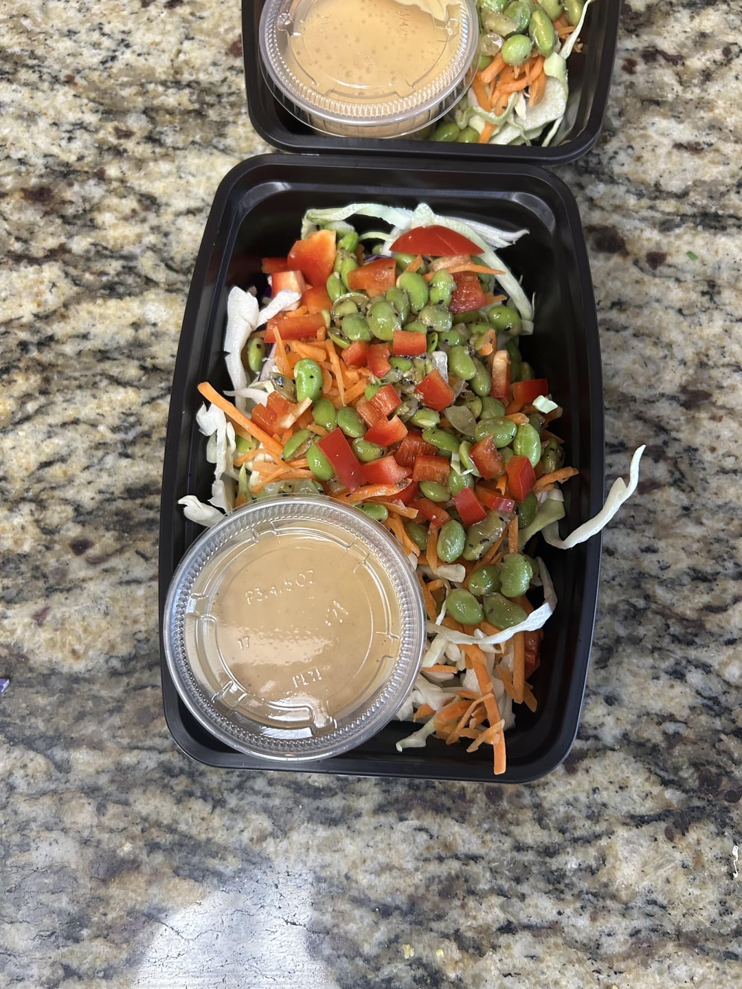 Asian Cabbage salad with edamame, carrots, and bell pepper and homemade Thai peanut dressing