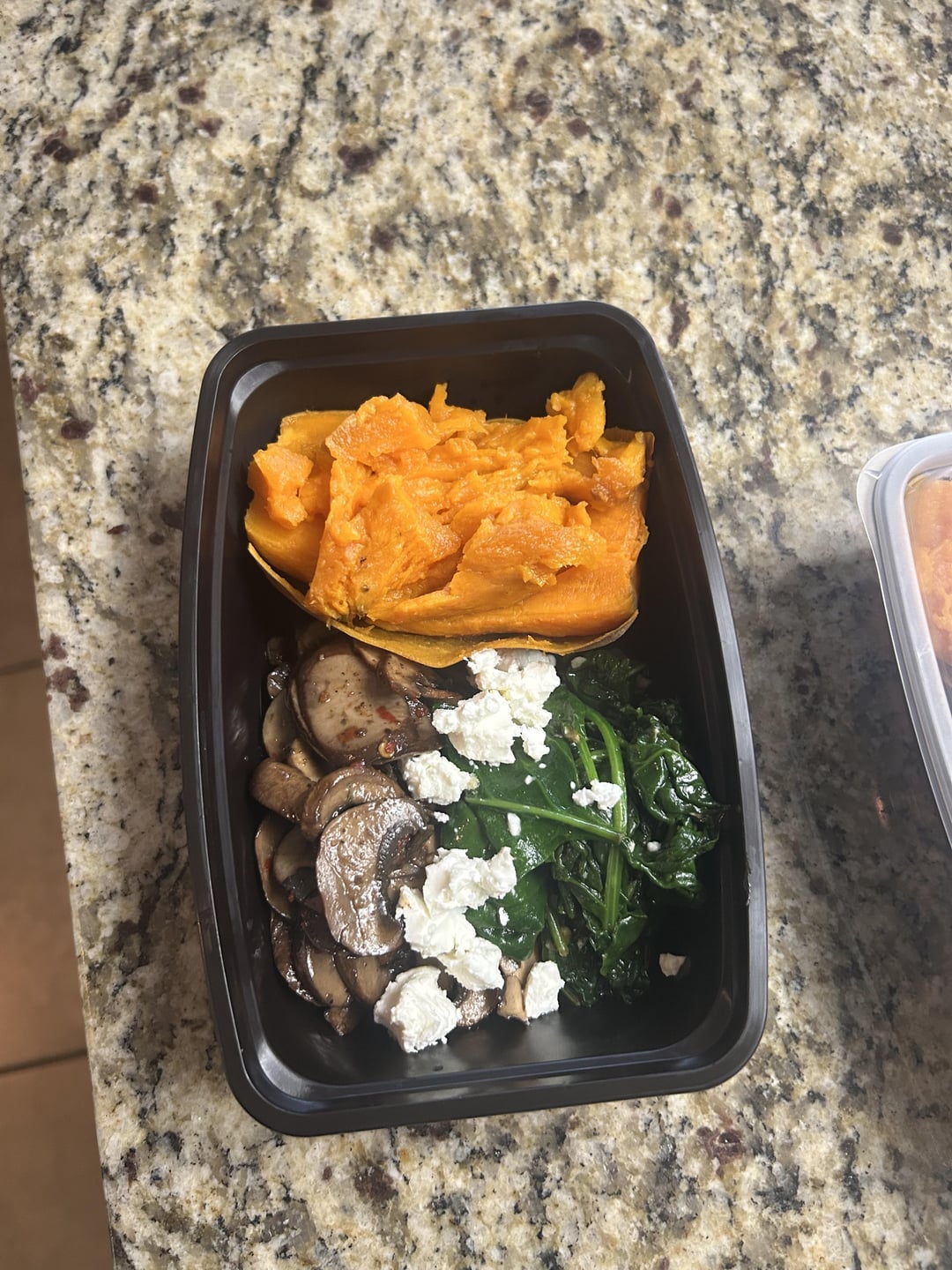 Mushroom and spinach stuffed sweet potato with goat cheese