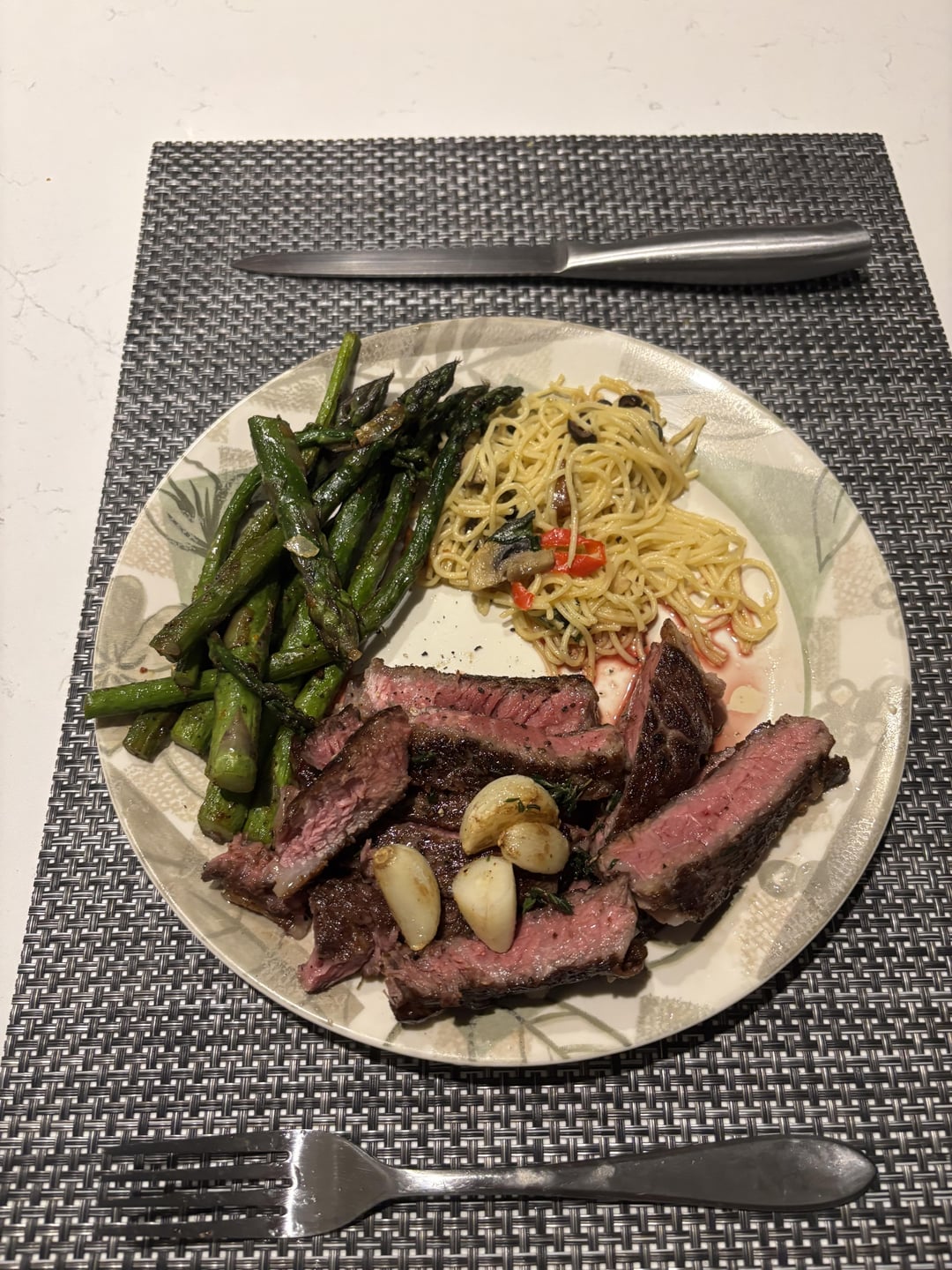 Looks great, but I would do is instead of whole garlic cloves…mince them and add some butter. Then put on top of the steak. Other than that looks delicious!