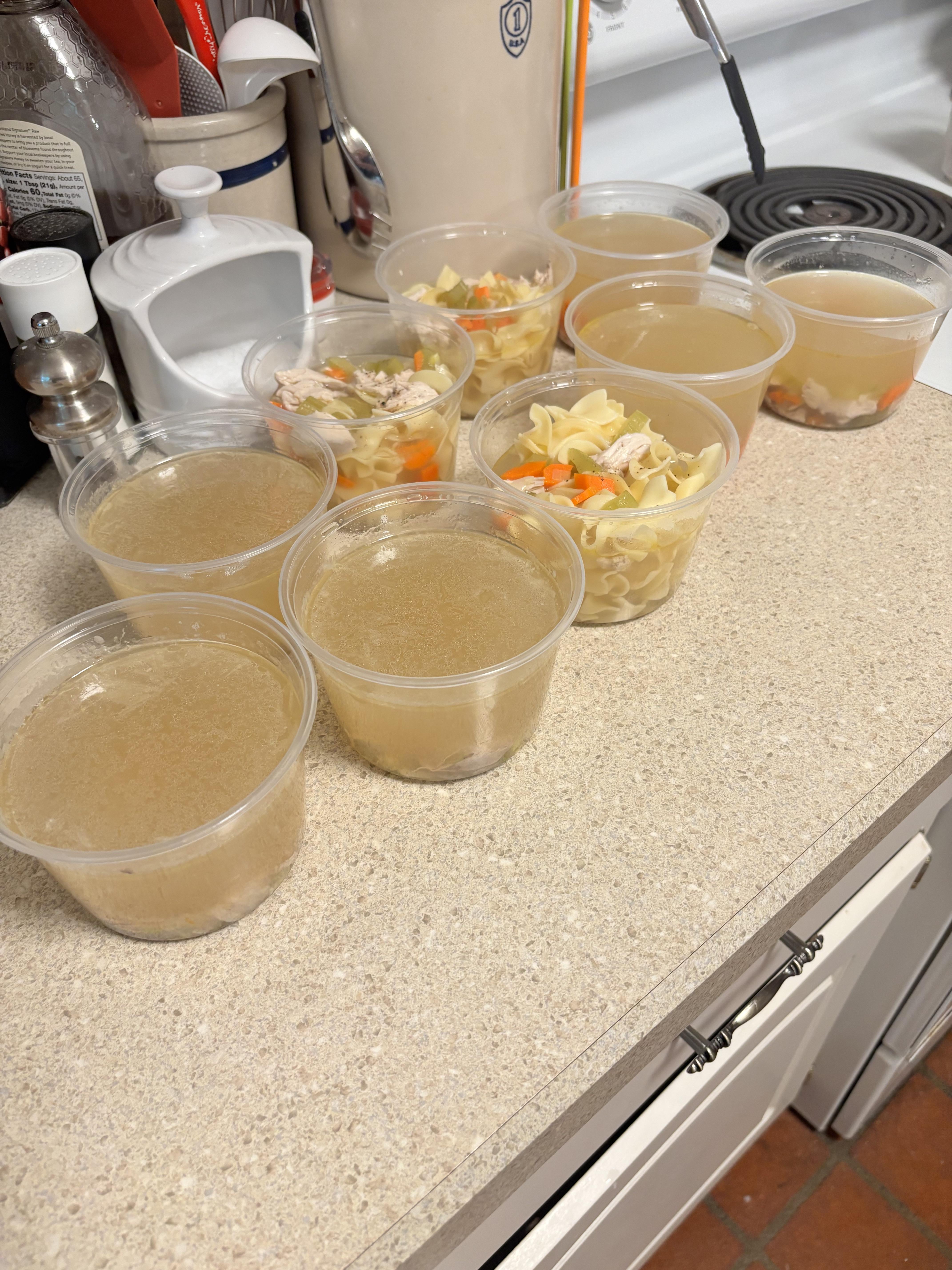 I make stock “blanks” that I use for later recipes. Tonight I did one chicken three ways: ginger scallion broth and chicken chunks for Thai curries this summer. Good ol chicken noodle soup. And basic chicken stock with chicken chunks for whatever.