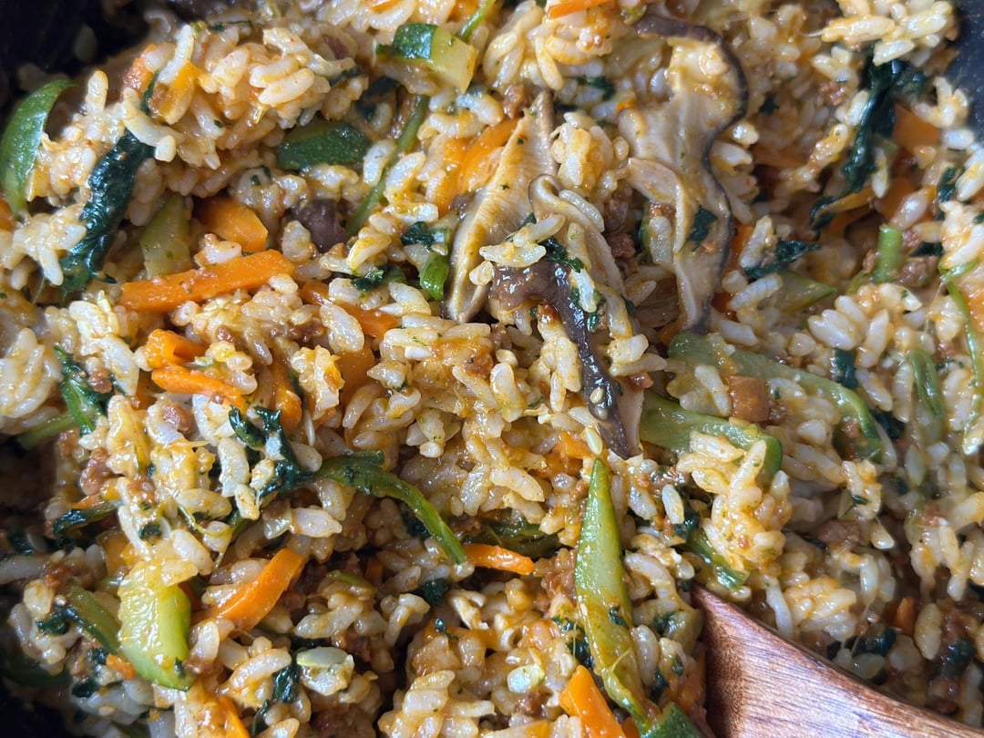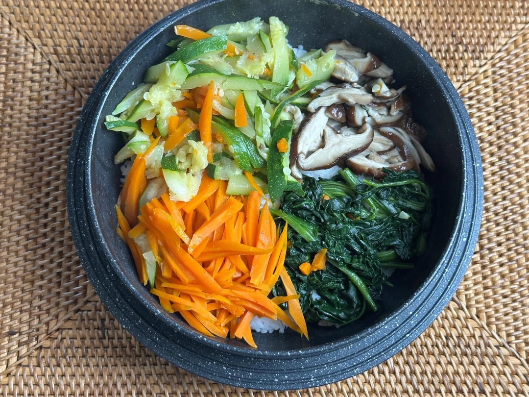 foodandspot 9 months ago **Full recipe link in bio****Ingredients** **Veggies**: 1 julienned zucchini, 1 carrot, 3 sliced shiitake mushrooms, ½ bunch spinach **Base**: Steamed short-grain rice **Sauce**: 100g minced beef, 3 tbsp gochujang, 1 tbsp garlic, 2 tbsp soy sauce, 1 tbsp sugar **Toppings**: 1 soft-boiled egg, 1 tbsp sesame oil, optional sesame seeds**Instructions**1. **Veggies**: Simmer all veggies with 100ml water + pinch of salt for ~6 mins. 2. **Sauce**: Cook beef, then add gochujang, garlic, soy sauce, sugar. Simmer 2–3 mins. 3. **Egg**: Boil 6 mins for jammy yolk, cool, peel. 4. **Assemble**: Rice + veggies + sauce + egg + sesame oil (and sesame seeds). Mix and enjoy!