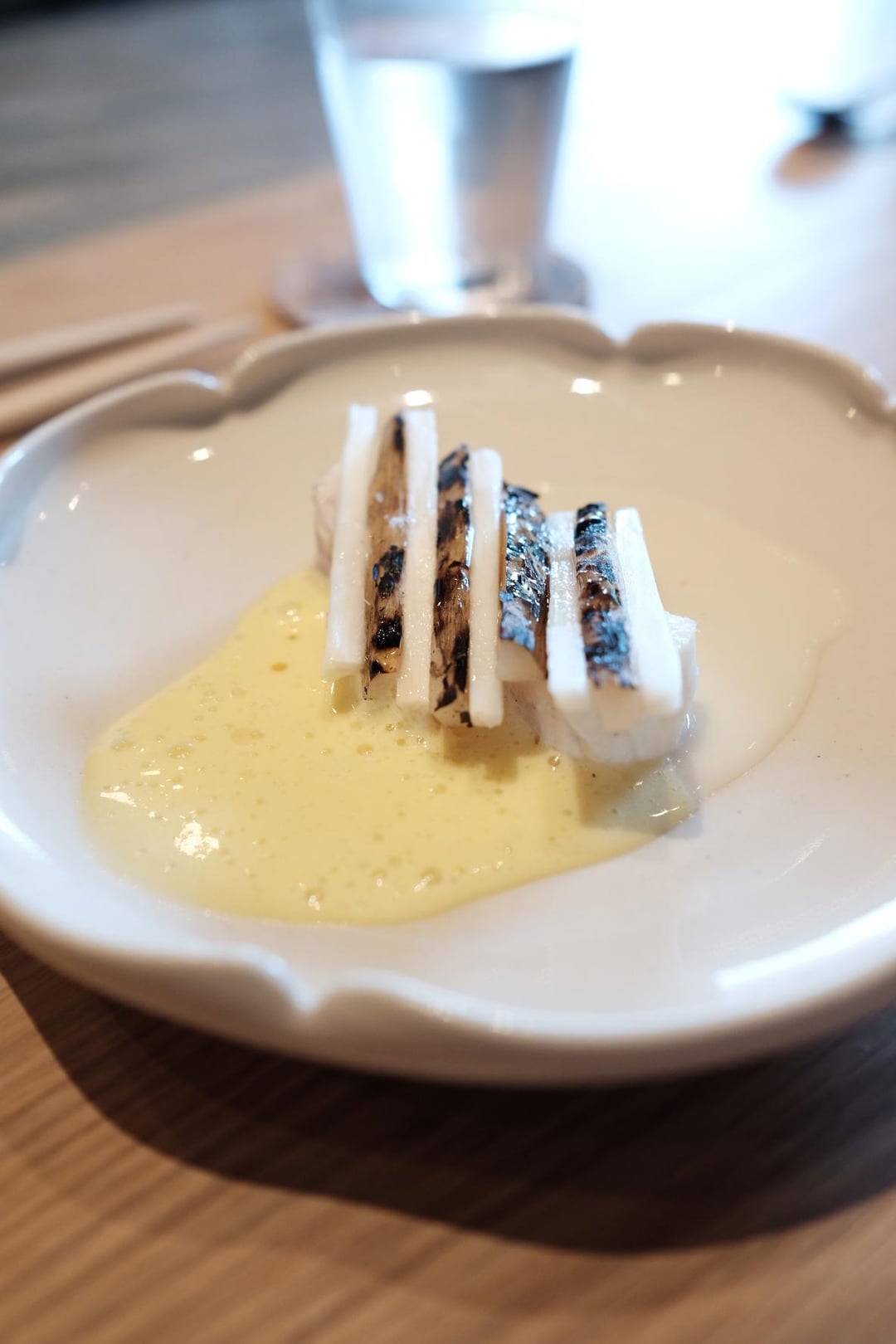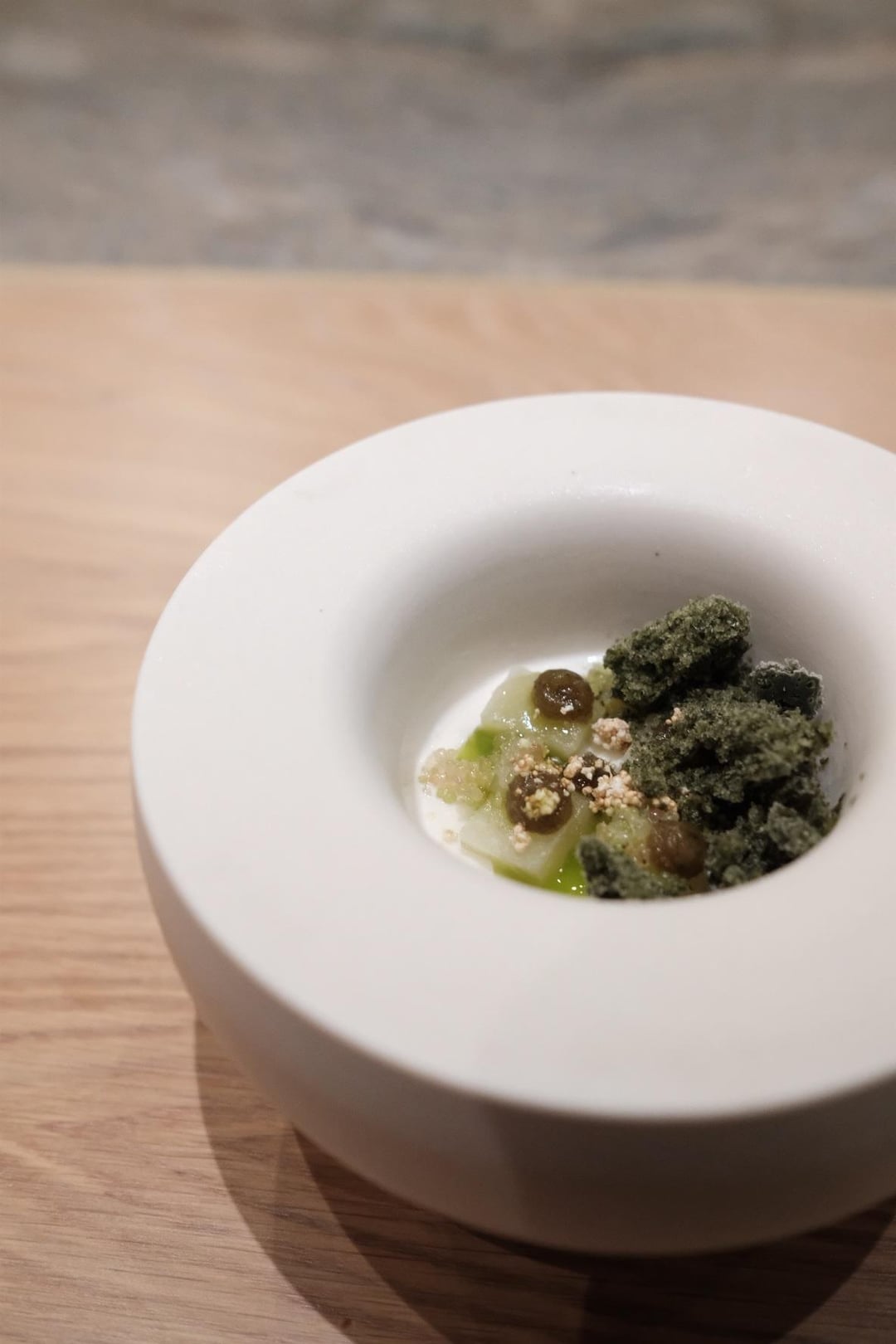 White Asparagus, Kohlrabi, Roasted Coffee Oil,
