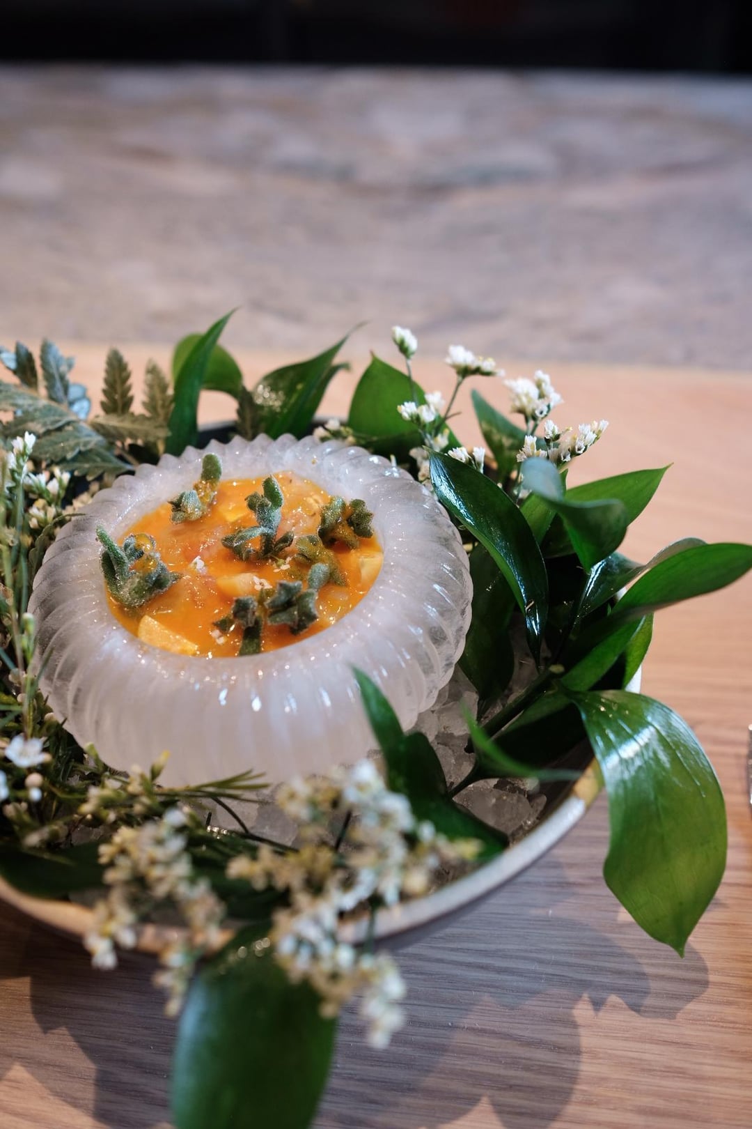 Served on Ice, Gooseberry, Ice Plant, a Sauce of Muddled Seabuckthorn, Lime Leaf, and Serrano