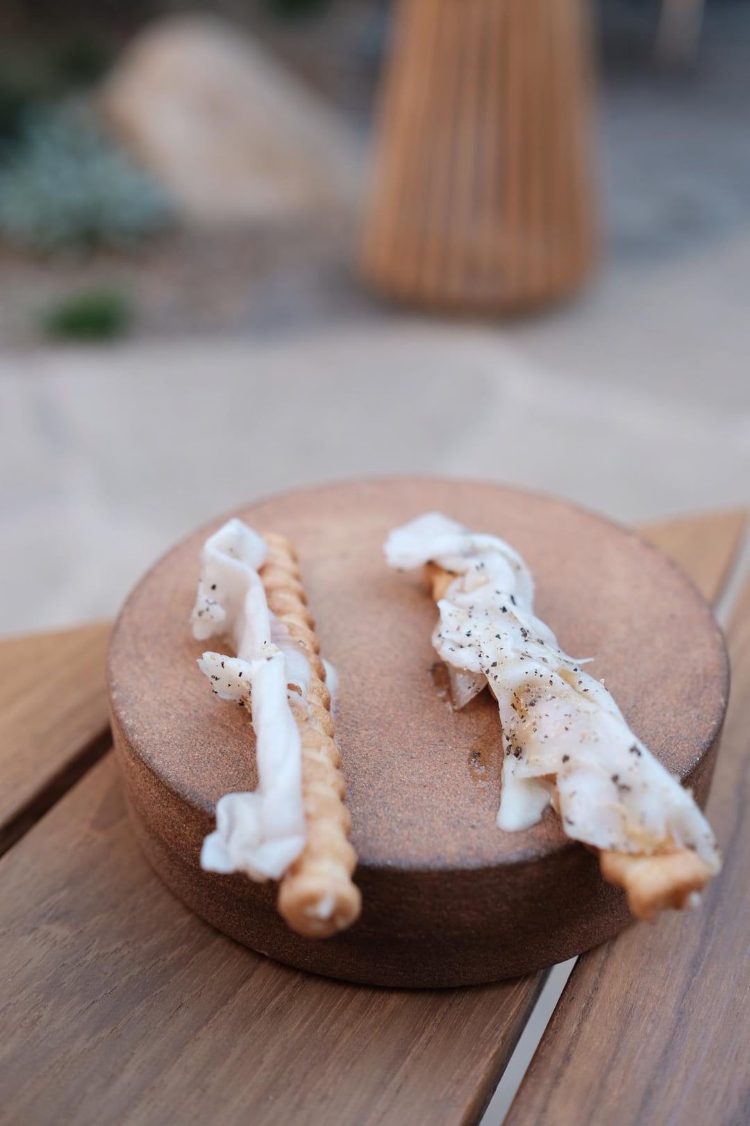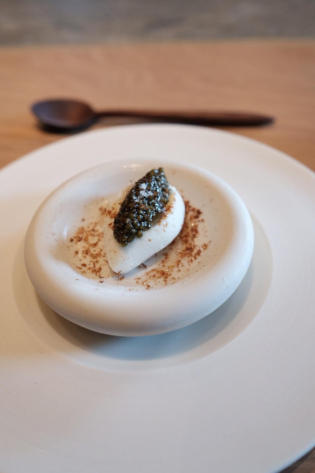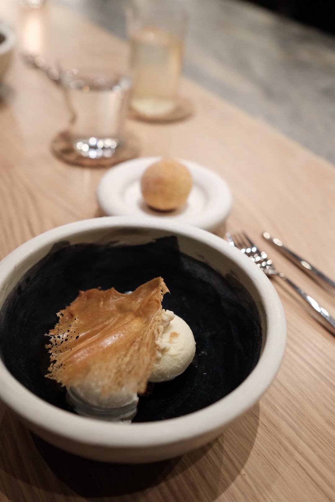 Orgeat Ice Cream, Smoked Celery Root Bushi, Freshly Pressed Almond Oil