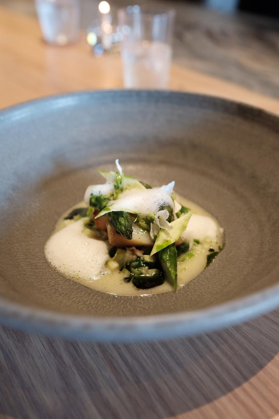 Roasted in Brown Butter, Chamomile Emulsion, Green Asparagus, Ramp, Oil of Rose Petals, Chive, and Green Garlic