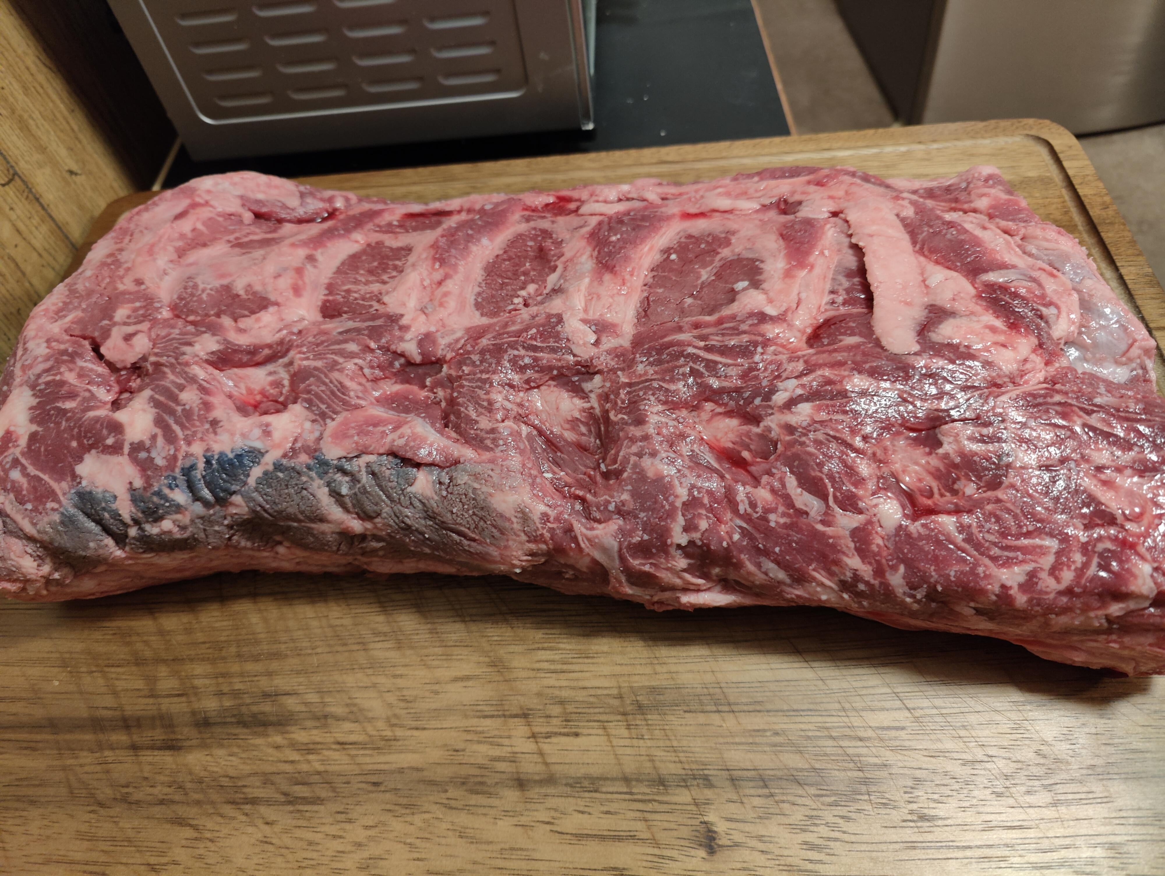 The color on the left side looks like some hot water damage from processing and some excess inspection ink, which is normally on the fat cap and is made from berries or something else food-safe like beet juice. Just trim it off and enjoy! I’m a meat cutter and both of these are normal to see on primals.