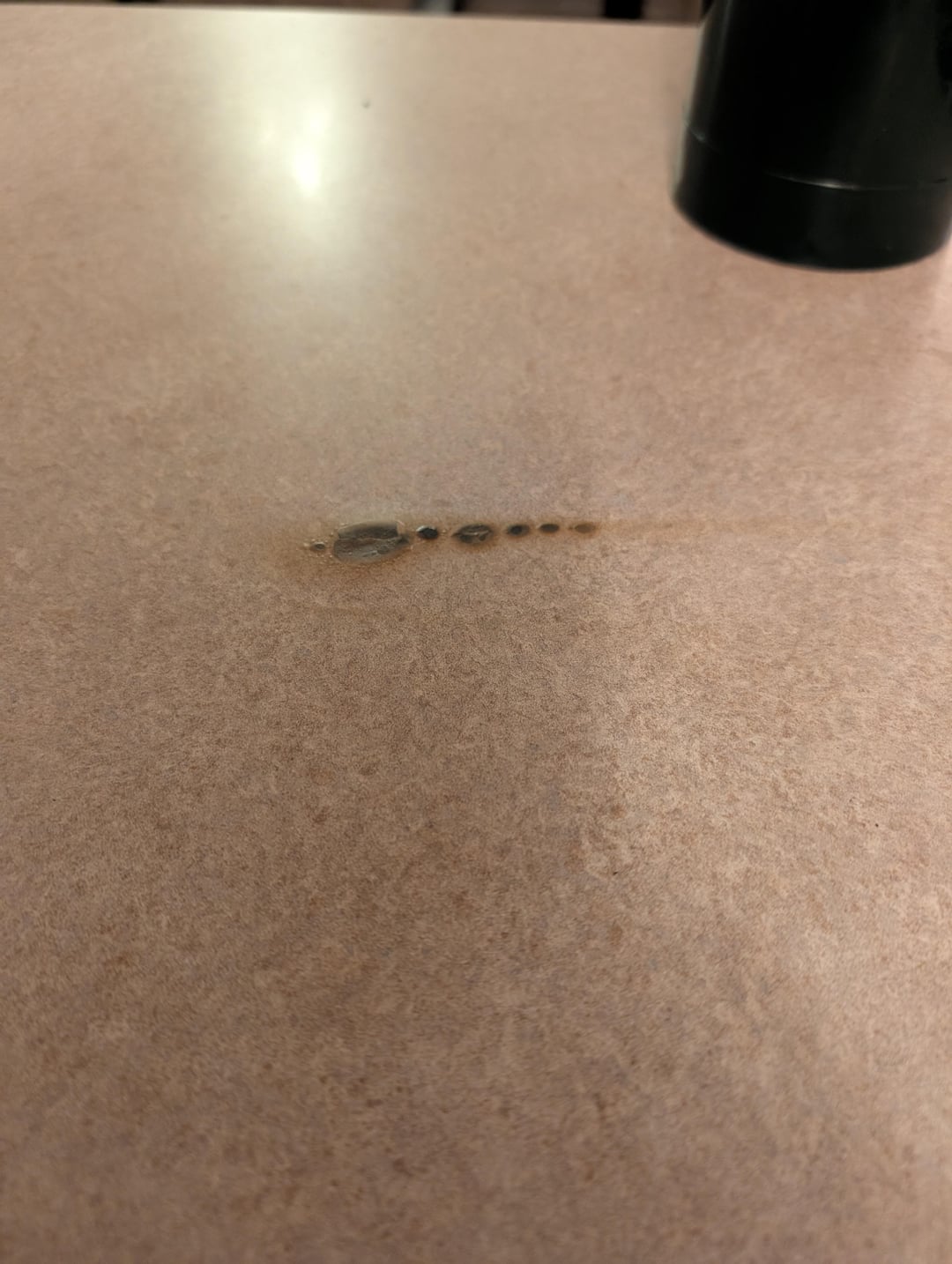 It almost looks like you had the torch on it so long that it completely dried up the surface, which kind of fits if you melted your grate and burned through to the counter. I’ve never gotten the metal hot enough to do that when I torch my steaks.