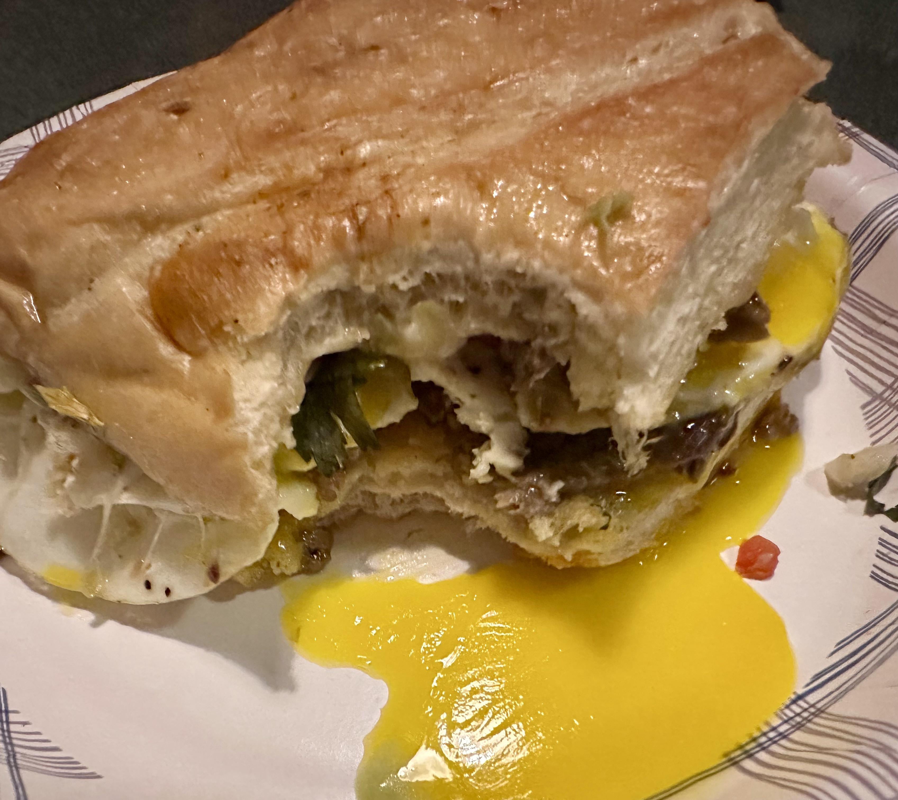 Leftover steak torta from a local food truck…. With an egg on it.by bootslikethese Write A CommentYou must be logged in to post a comment.