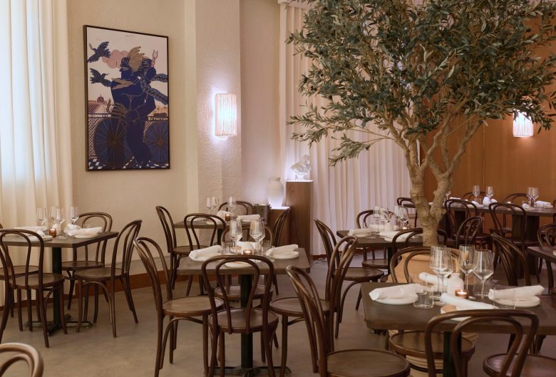 CKMS’s design of Nerina’s 3,500 square foot interior was inspired by the understated elegance of 1970s Athenian apartment lobbies. The airy, high-ceilinged space is anchored by a deep green marble bar with the indoor dining room to its left and a glass-enclosed outdoor dining area to its right. The heated 1,500 square foot patio will be open to guests this spring.