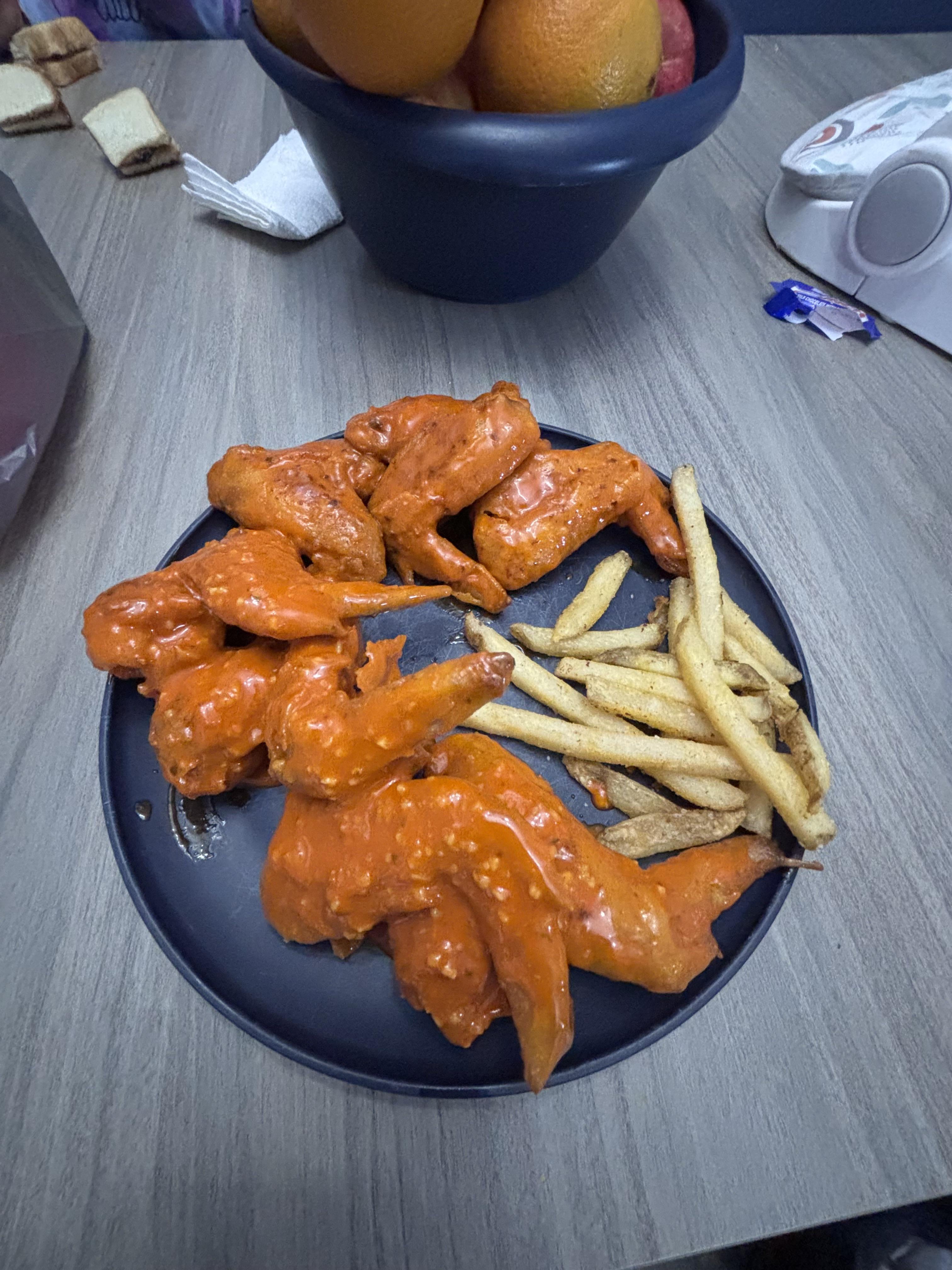 Wanted to experiment with injecting with chicken wings to see if there was a major improvement. Injected these flappers with Buffalo hot sauce. Then added Then some fresh garlic and danos cheeseoning with hot sauce. Air Fried for 20 mins at 360. They were good but not my best. 7.7/10. But the presentation minus the fries I give a solid 8.6:10.