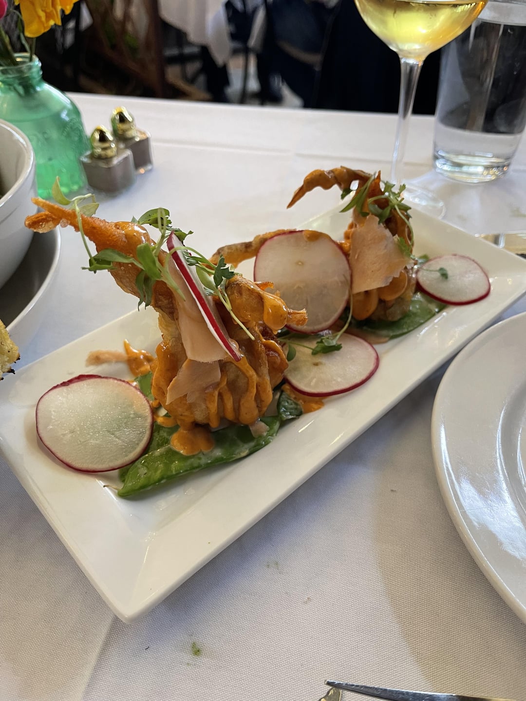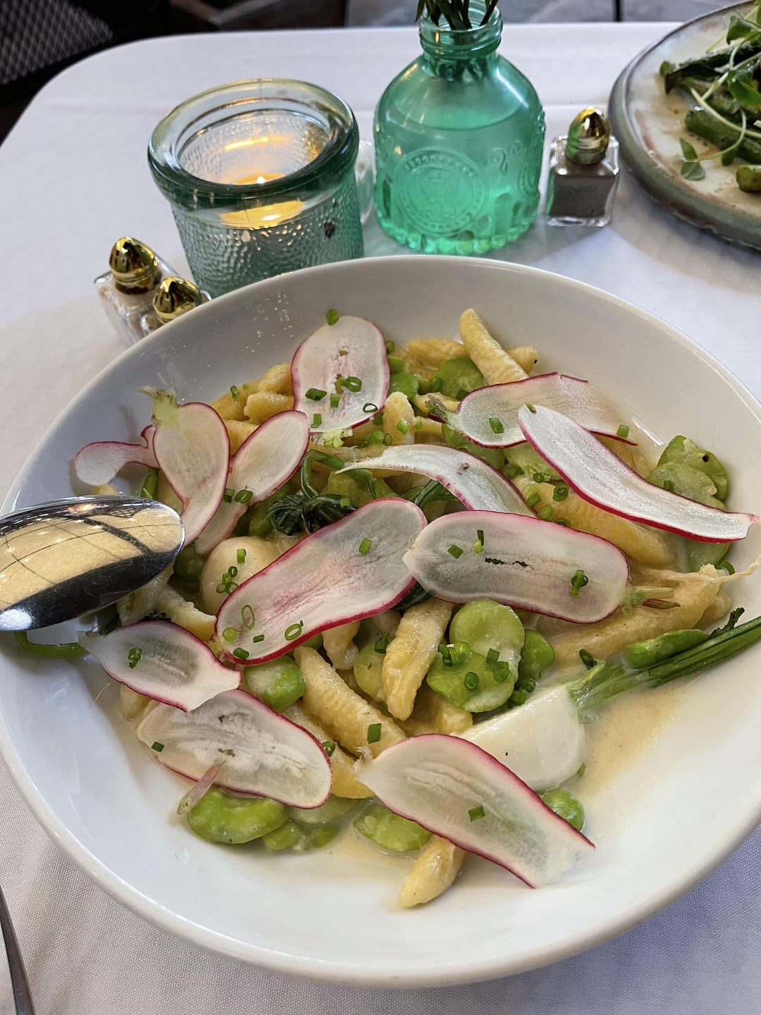 First up we have grilled asparagus with ramps, deviled eggs, and sauce gribiche. At the same time we enjoyed the ricotta cavatelli with fava beans and radishes and lots of lemon.