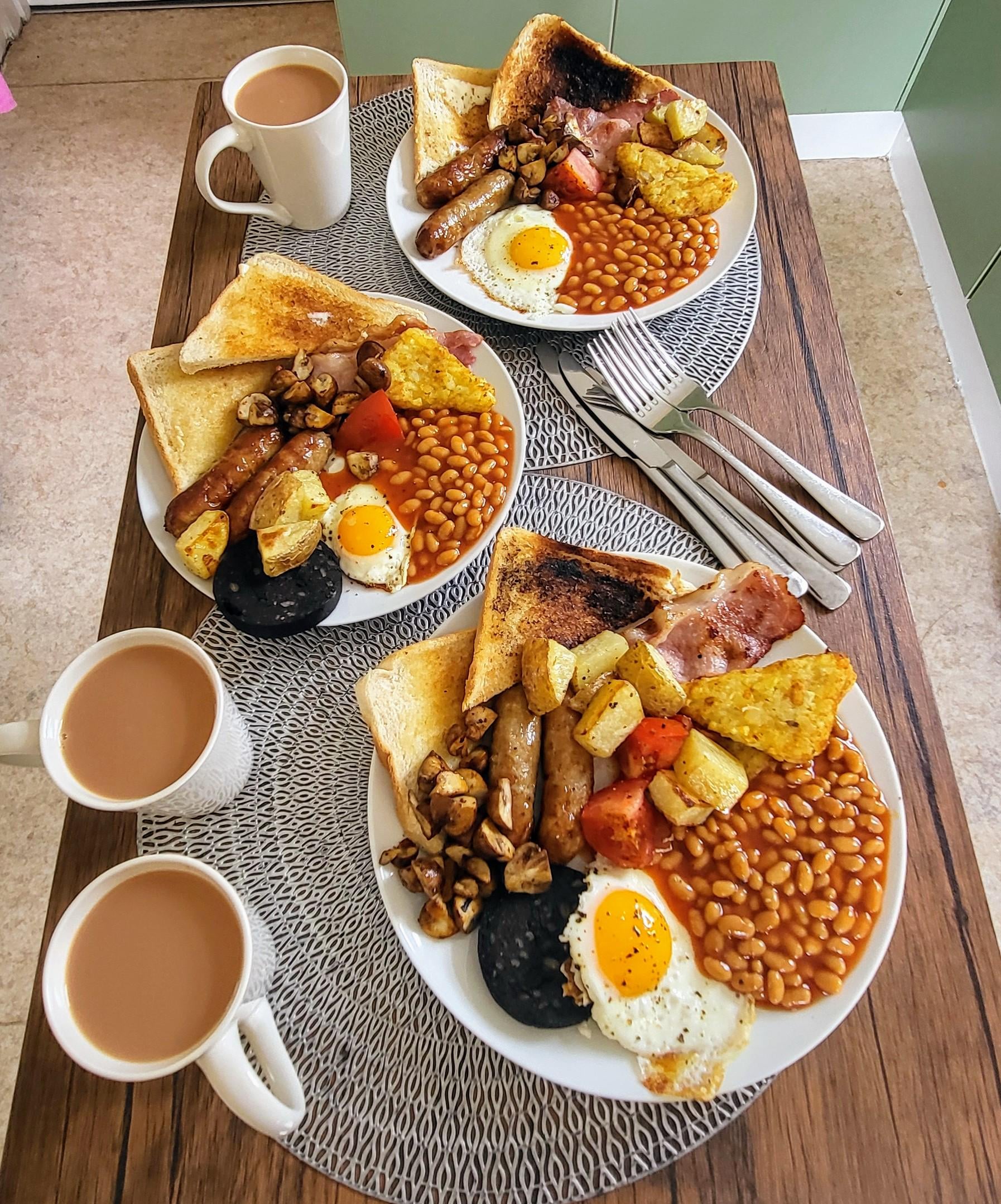 Sausages, bacon, eggs from Green Lane Farm Shop (fresh and top-tier!), beans, toast, mushrooms, black pudding, hash browns, fried potatoes, and of course, a cuppa to wash it all down. 🍳🥓🍞🍅