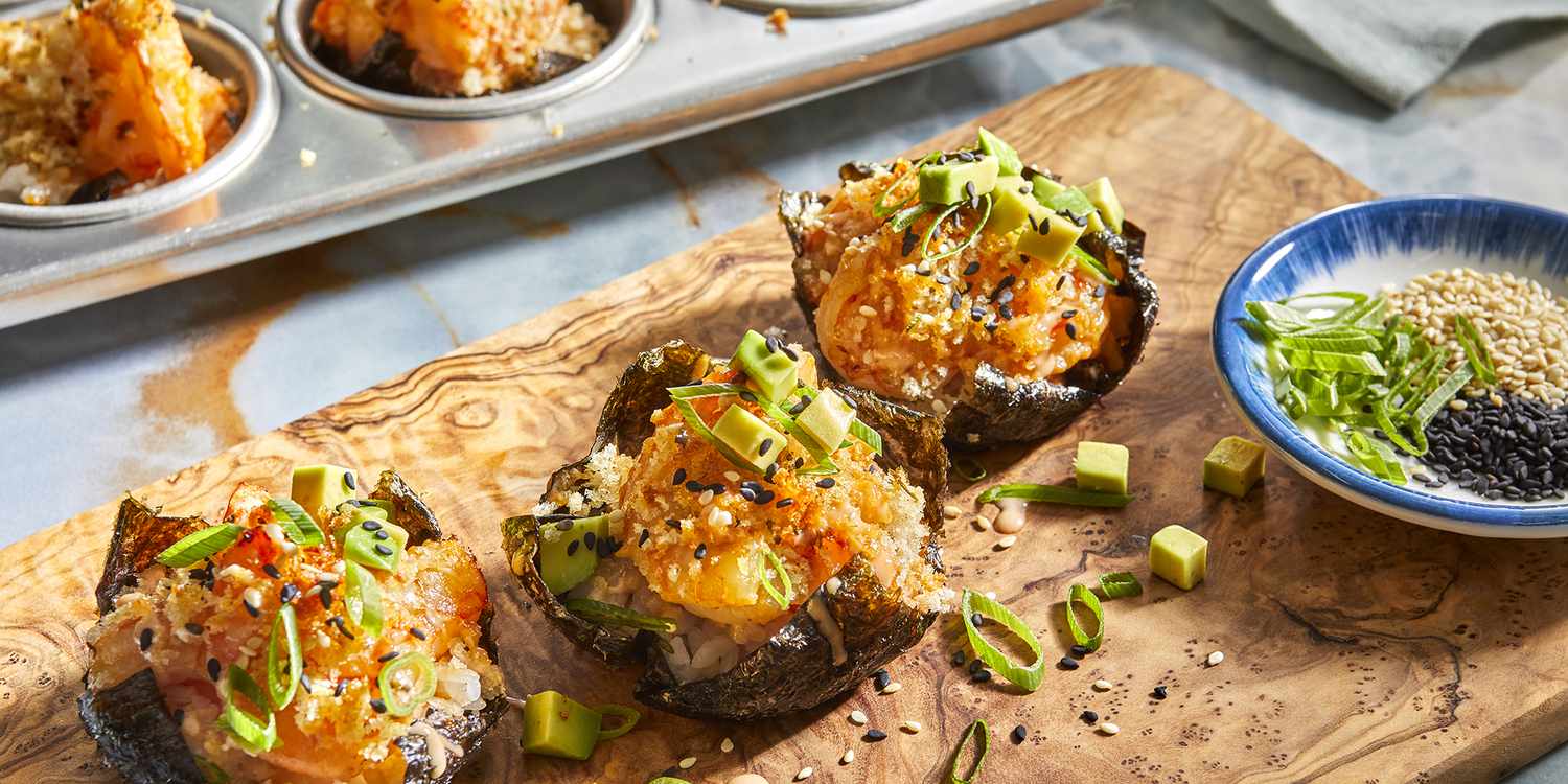They’re pretty simple to make. You simply season cubes of salmon with soy sauce, mayo, and salt, though I also like to add a little sriracha for heat. You cut large sheets of nori—the dried seaweed used to wrap sushi—into quarters and add a few tablespoons of seasoned sushi rice to their centers. Place the nori into the muffin tin indentations and top with salmon. Bake at 400 degrees Fahrenheit for about 15 minutes, then drizzle more mayo (and/or sriracha), sesame seeds, and scallions. Pop those little suckers out and devour.