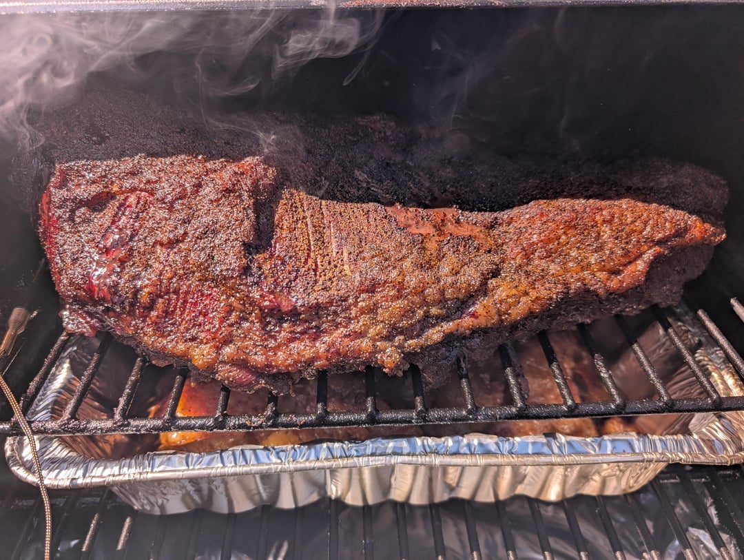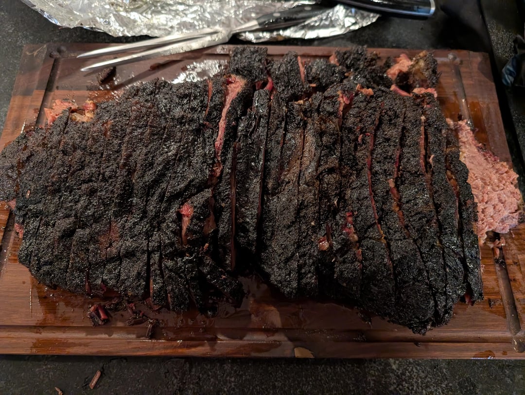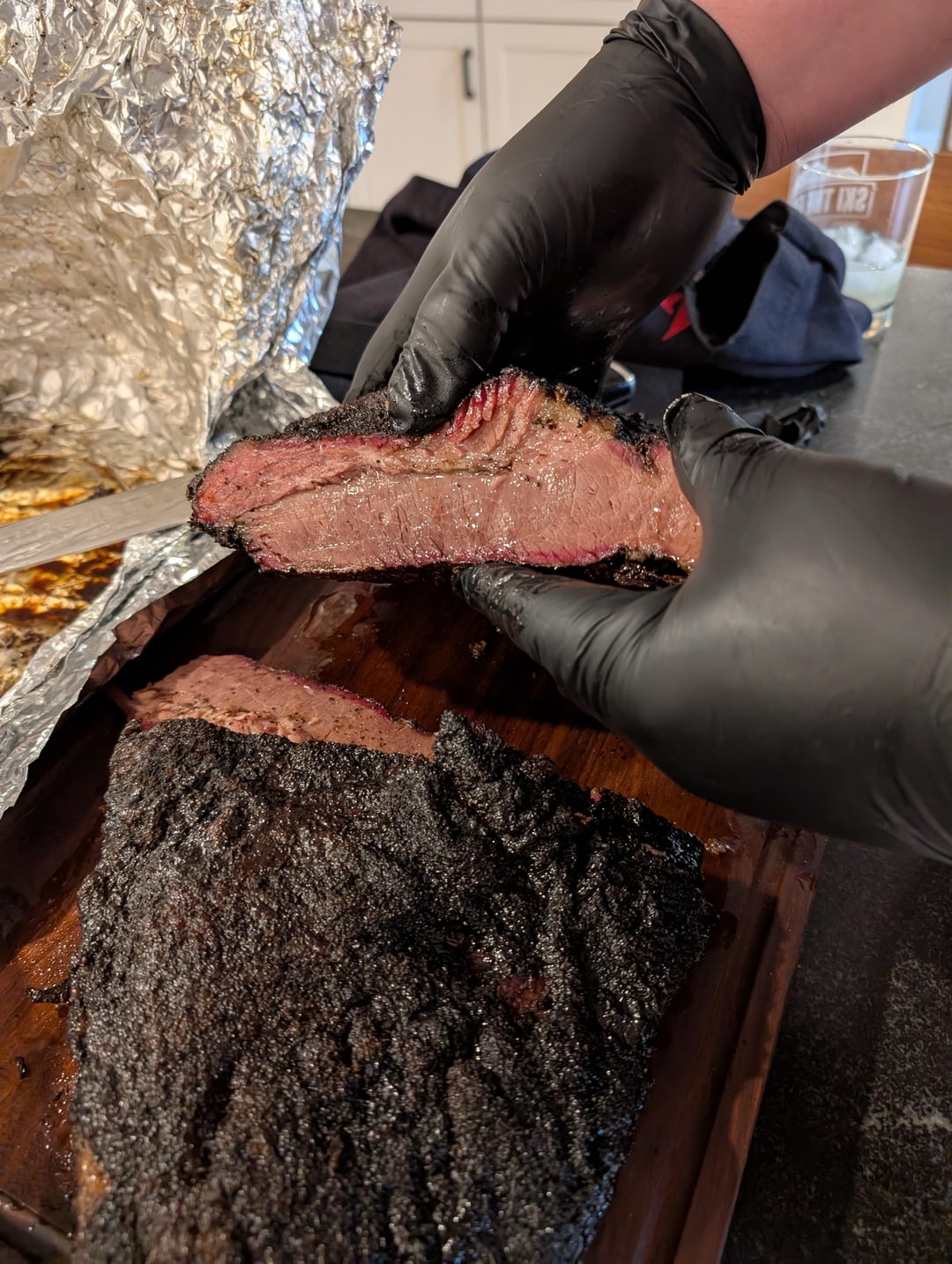 Hit the stall around ish hours in, bumped temp to 275 to push through the stall before dropping the temp. Overall it was on the smoker about 13 hours. Used the goldees method of no wrap during smoked. Pulled it when it felt tender (well the point was super tender) then wrapped in foil with the smoked tallow and then left it in my anova oven over night and all day. I now know the rough timing and can do it without using the crazy hold.