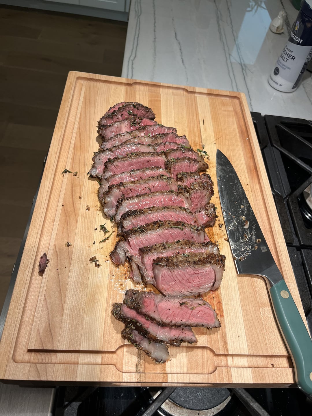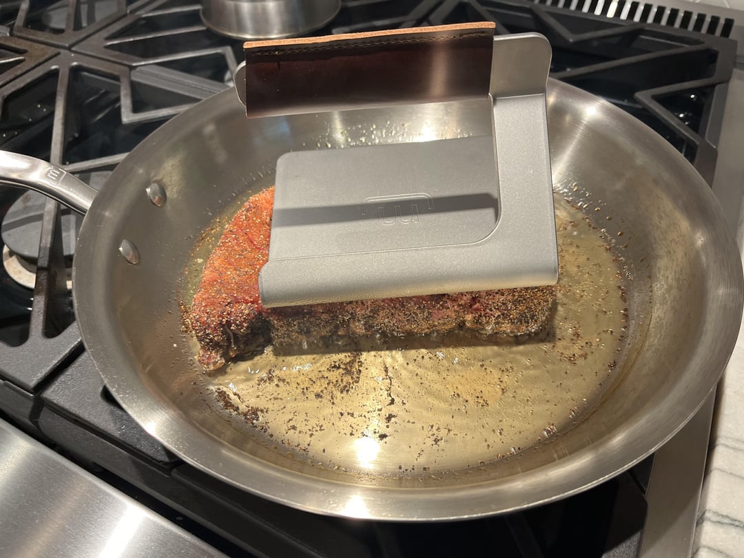 Bought what I thought looked like a good ribeye from Whole Foods. I like to reverse sear and grill my steaks but it was raining out. So I tried s pan sear, 1st time using a hamburger press for weight and finished in the oven for 5m until it hit temp. I think this turned out pretty good!